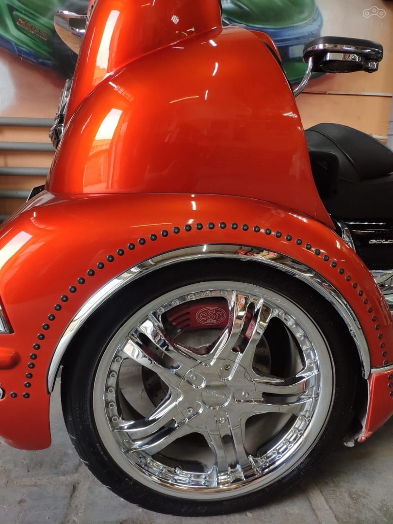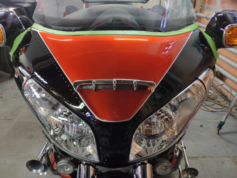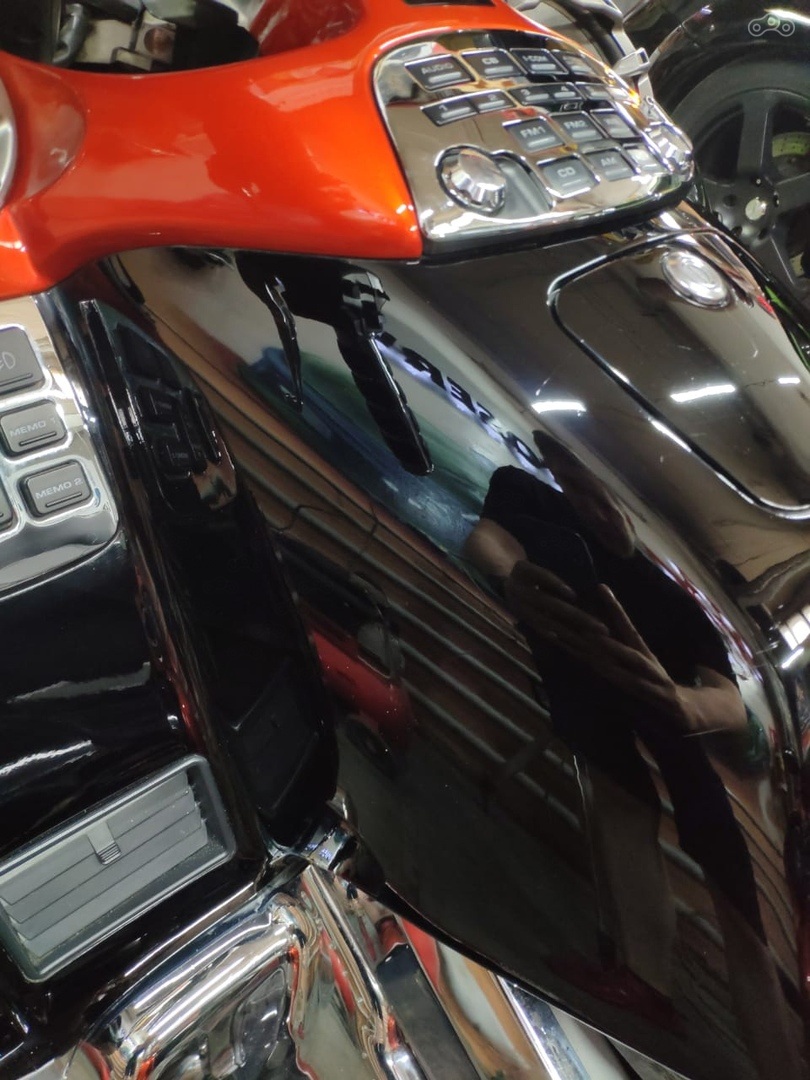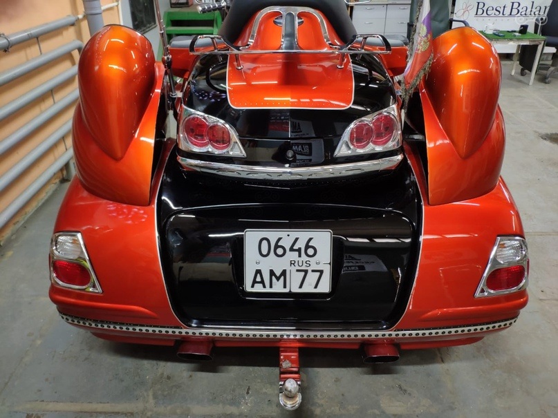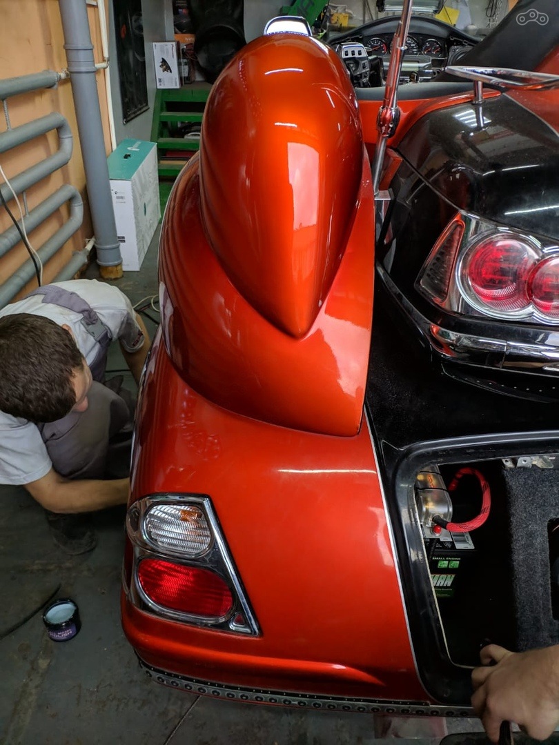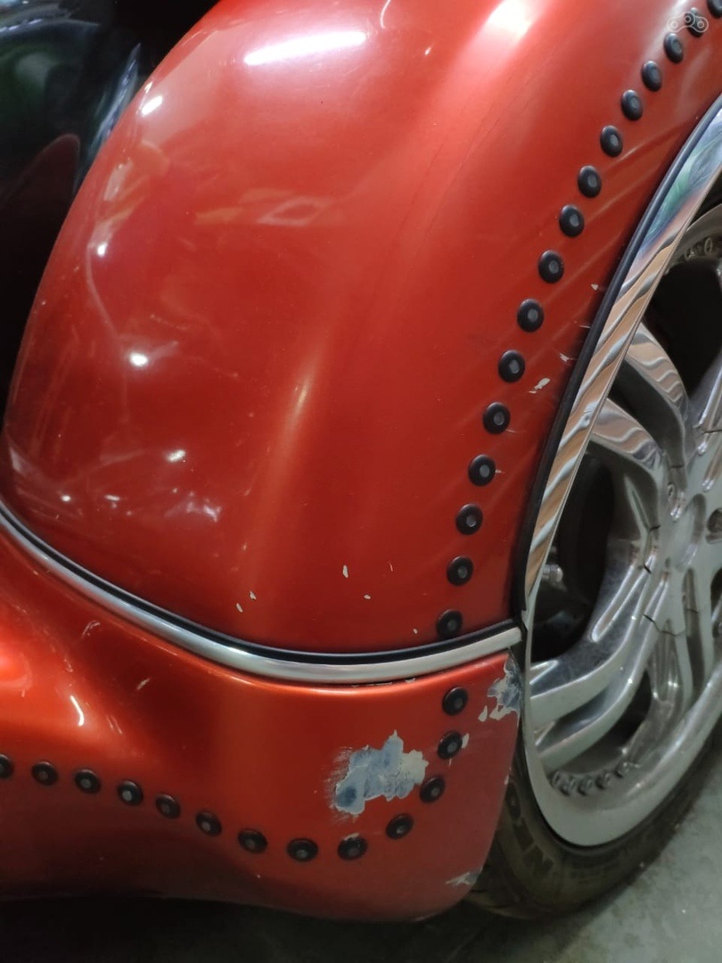 Далее наш мастер по полировке подобрал краску, устранил все возможные сколы, царапины и тщательно отполировал весь Трайк, вернув ему прежний насыщенный цвет.