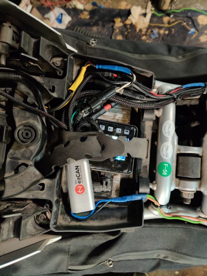 Глубоко в жопе под сиденьем пассажира спрятан нужный нам разъём, он подключен в заглушку чтобы не пылился. Жёлтый провод раньше исполнял роль контрольного, теперь он мне не нужен. Подключаю Ez-CAN к мотоциклу, втыкаю вторую часть удлиннителя в заглушку, собираю заднюю часть мотоцикла обратно, пока не забыл что откуда выкручено.