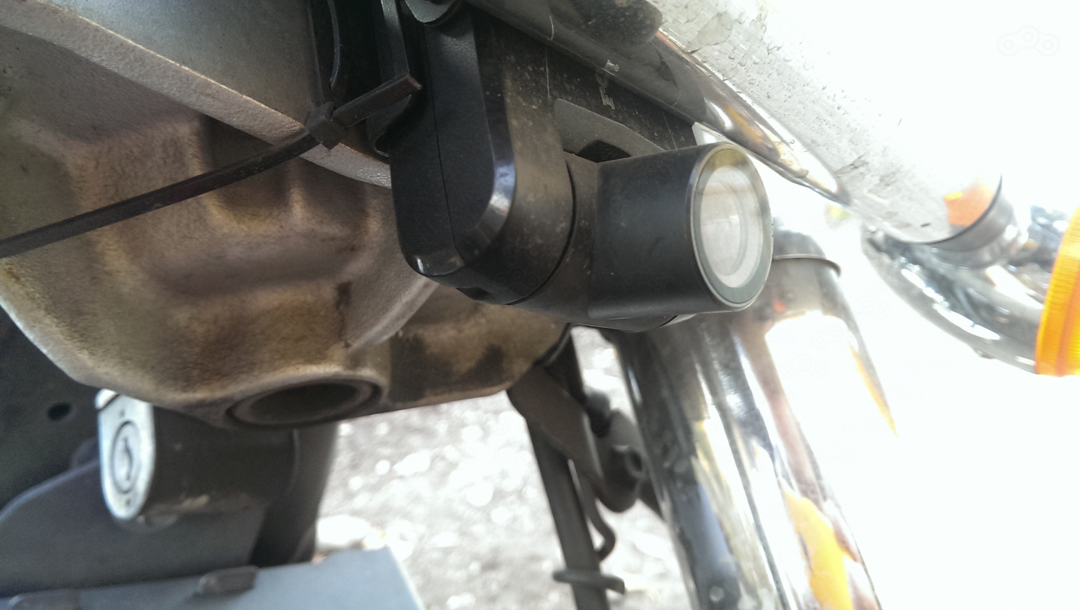 Монтаж особой сложностью не отличался. У меня есть дополнительная проводка (которую я создавал сам чтобы не трогать оригинальную и как-нибудь обязательно расскажу), напряжение на которой появлялось вместе с зажиганием - туда же и был подцеплен регистратор. Вопрос монтажа решился неожиданно - я временно прицепил камеру под поворотники, ожидая, что её закидает с трассы, однако этого не произошло. Из-за удачного расположения её практически не закидывает и вы могли уже убедиться в этом если читали 2000 миль спустя. В другой поездке более часа она находилась под дождём, а я - на МКАД и шоссе, но камера так и осталась достаточно чистой.