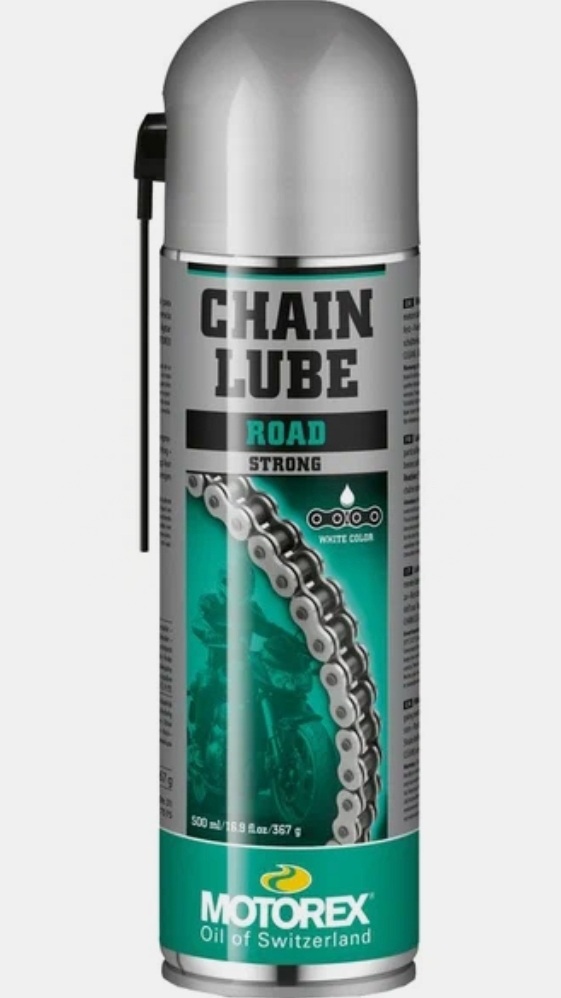 Этот самый балончик Motorex Chainlube Road Strong 0,5l исправно смазывал меня потом 12к км, отличаясь хорошей стойкостью и малым расходом. Смазка уверенно выхаживала под 1000км, спокойно переносила дождь и её было удобно наносить за счёт длинного носика и белого цвета-индикатора.