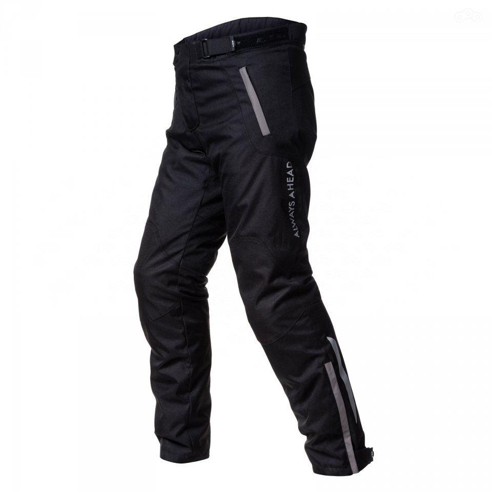 Брюки CHART MEN PANTS — квинтэссенция мотоциклетных штанов: ничего лишнего в дизайне, при этом, весь необходимый функционал на месте. Пошиты они из 100-процентного полиэстера разной плотности, с учётом мотоциклетных особенностей — на бёдрах и коленях ткань заметно толще. Крой приятный, и на меня они сели сходу, поэтому дальше даже не пошел выбирать.