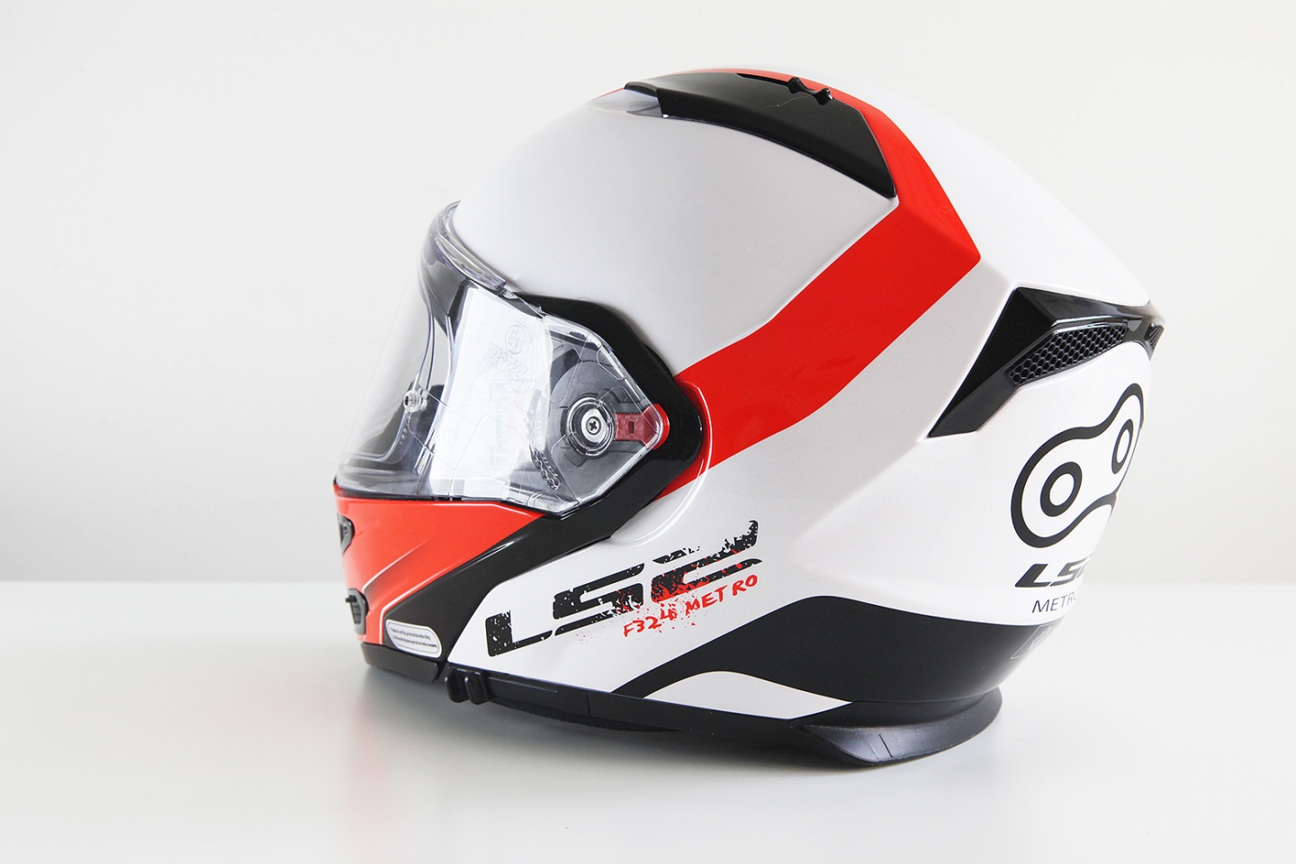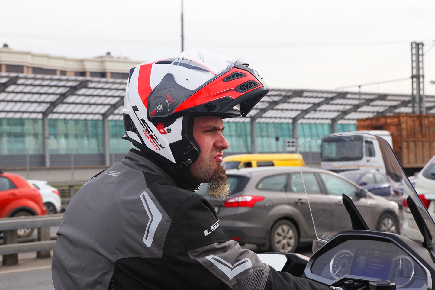 Шлем LS2 FF324 Metro Rapid доступен в трёх расцветках, среди которых есть пенсионерская чёрно-белая, чёрно-жёлтая и бело-красная. Я выбрал последнюю, хотя и колебался — кислотно-жёлтая тоже выглядит броско и хорошо заметна на дороге. В любом случае, шлем выглядит нарядно, то что нужно для наших съёмок.