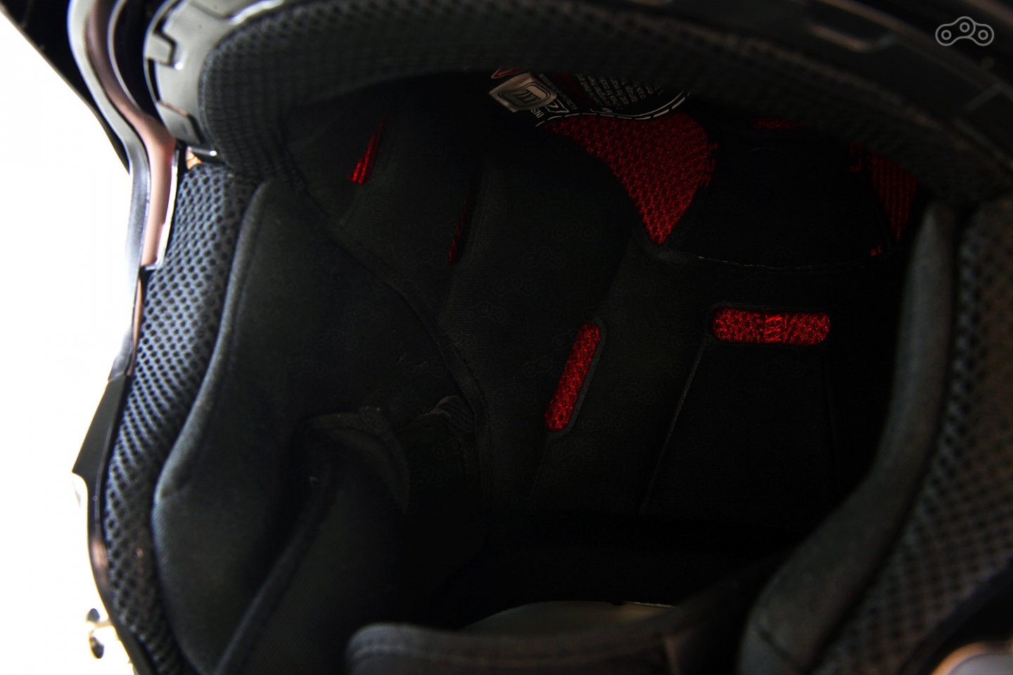 Подкладка выглядит просто и без изысков, зато перфорация для лучшей вентиляции головы такая же, как и у топовых моделей, а в наполнителе шлема — выемки под наушники, благодаря которым установка гарнитуры не займет много времени. Крепится подкладка традиционными кнопками, и, при необходимости, например для стирки, снимается за минуту.