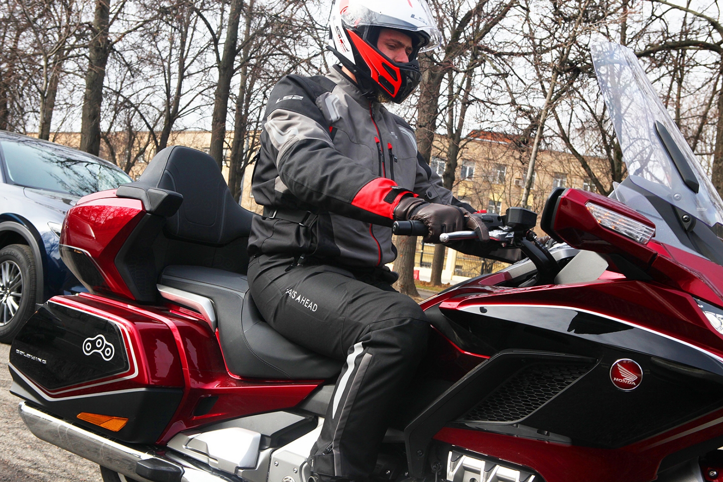 Остальное — в рамках жанра: надёжные и довольно большие вставки на плечах и локтях, а также «пенка» в спине, которую, необходимо заменить чем-нибудь более увесистым и сертифицированным. Сверху — светоотражающие вставки и интересная система регулировки воротника, снизу — молния, позволяющая подстёгивать куртку к брюкам. Иными словами — достойный функционал, который мы уже испытали в тесте нового Honda Gold Wing.