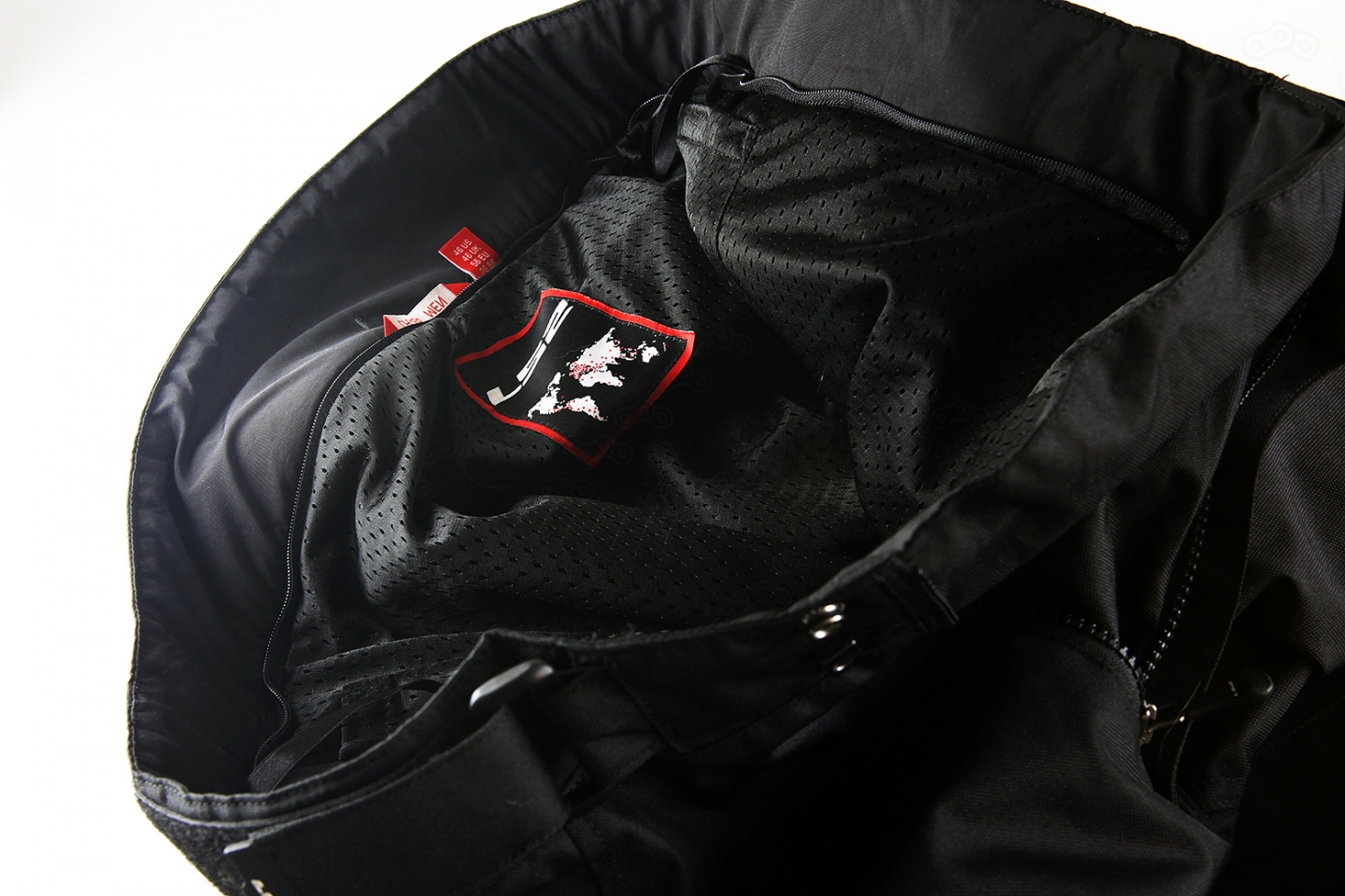 Снаружи — два типа ткани из 100% полиэстера, одна, серого цвета – потоньше, вторая, черная, расположенная на плечах и локтях – поплотнее, явно с расчетом на вероятность контакта этих зон с асфальтом. Внутри, по заявлениям производителя, водонепроницаемая мембрана, но проверить её стойкость пока не довелось.