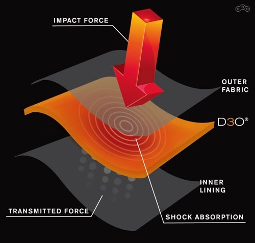 Защитные вставки Furygan D3O - это ярко-оранжевый полимер, изобретенный в 2005 году. Он легкий, мягкий, гибкий, может принимать любые формы. В случае удара молекулы мгновенно образовывают прочные связи, делая материал жестким. Это существенно снижает силу удара и распределяет его силу по всей поверхности вставки. После того, как воздействие удара заканчивается, материал легко принимает первоначальную форму и не теряет свойства.