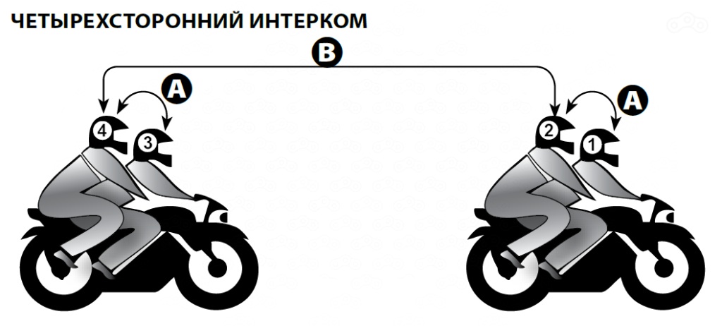 Так вот, в режим точка-точка двое, или «двухсторонний интерком» умеют абсолютно все мотогарнитуры. Я не смог сходу вспомнить тех кто этого не умеет, а если они и есть — зачем они нужны?