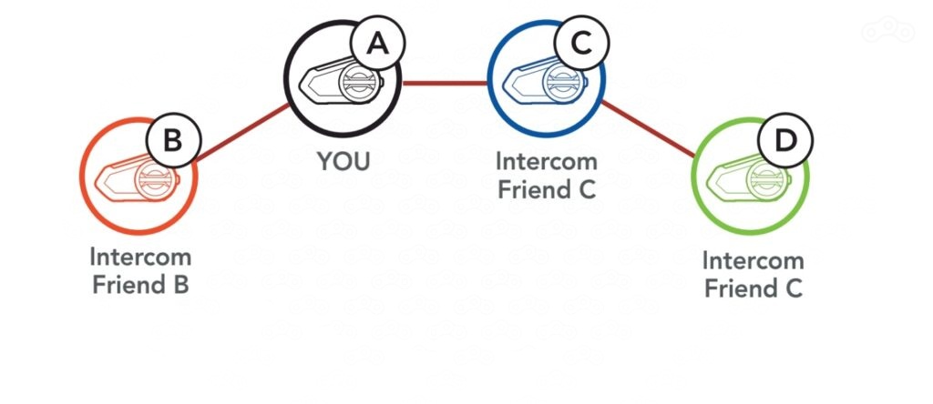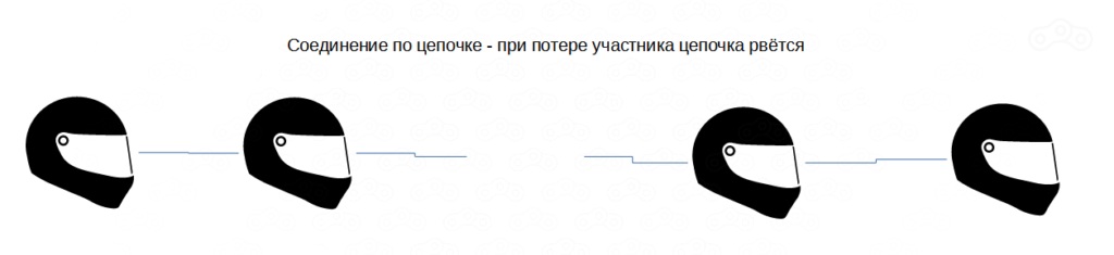Во первых, нужно спарить гарнитуры в определенном порядке. Во вторых, нужно следовать этому порядку и при поездке для уменьшения помех. В третьих, если человек из середины цепочки потеряется (заправка / разрядился / домой и т.п.) то цепочку нужно сомкнуть или будет два куска. При чём сомкнуть это запустить сопряжение, умудрившь объясниться без связи — или остановить всю группу. А если вернулся, а цепочку уже починили — то ему нужно делать сопряжение с крайним, объяснившись на ходу?) Неудобно. Но решение есть: