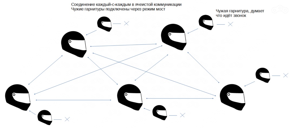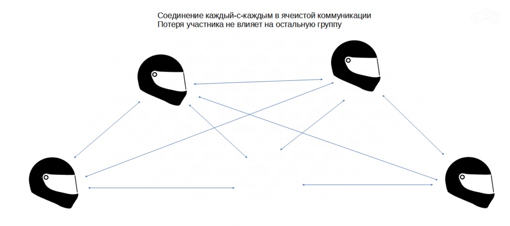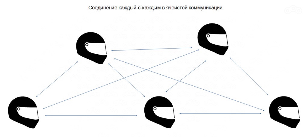 Суть ячеистой коммуникации заключается в том, что в рамках одной объявленной группы каждая гарнитура пытается соединиться с каждой другой — это увеличивает пропускную способность сети, расход батареи и позволяет полностью игнорировать выпадение отдельных участников, перестраивая сеть «на лету».