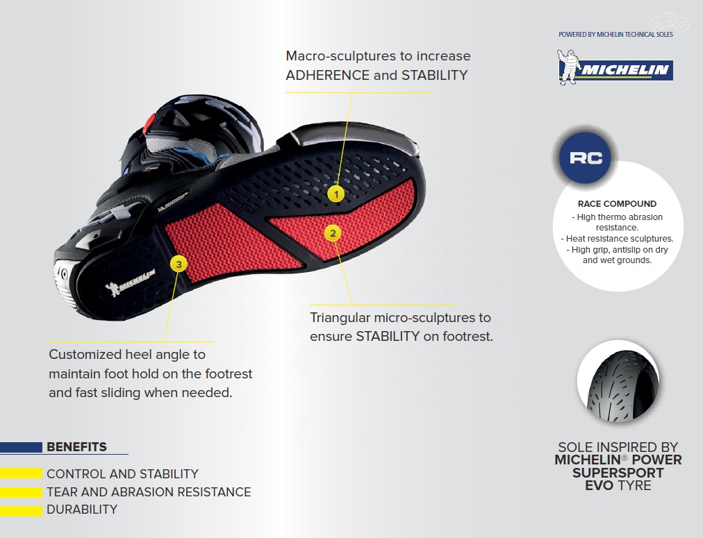 Некоторые линейки и модели мотоциклетной обуви TCX оснащены инновационными подошвами MICHELIN Tech. Данная подошва разрабатывается на основе технологий, применяющихся в шинной индустрии, что резко снижает риск получения травм.