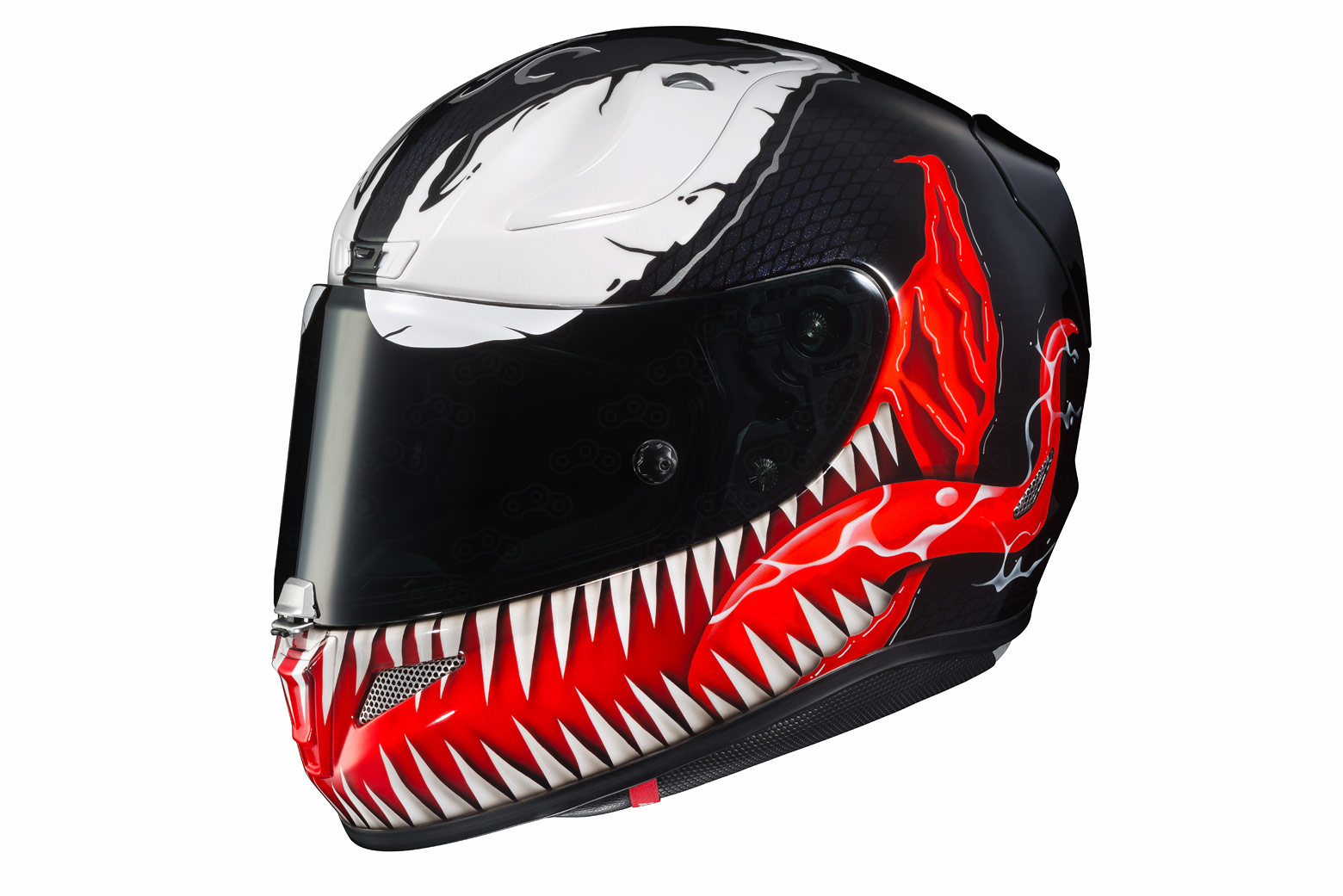 Веном – инопланетный симбионт, наделяющий своего носителя выдающимся физическим данными, питаясь при этом адреналином из его надпочечников. Шлем Венома выглядит более брутально, чем защита Человека-Паука: черный глянец, перетекающий в чешую, а также зуба-стый оскал на нижней части шлема не оставят равнодушным ни любителей необычной мото-экипировки, ни фанатов вселенной Marvel.