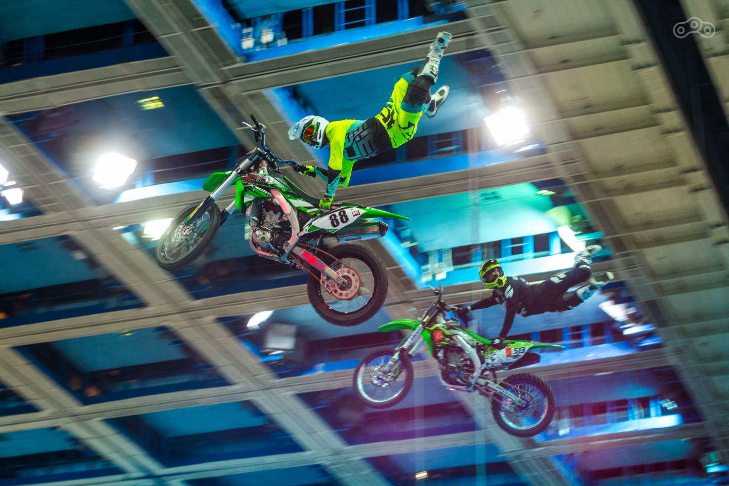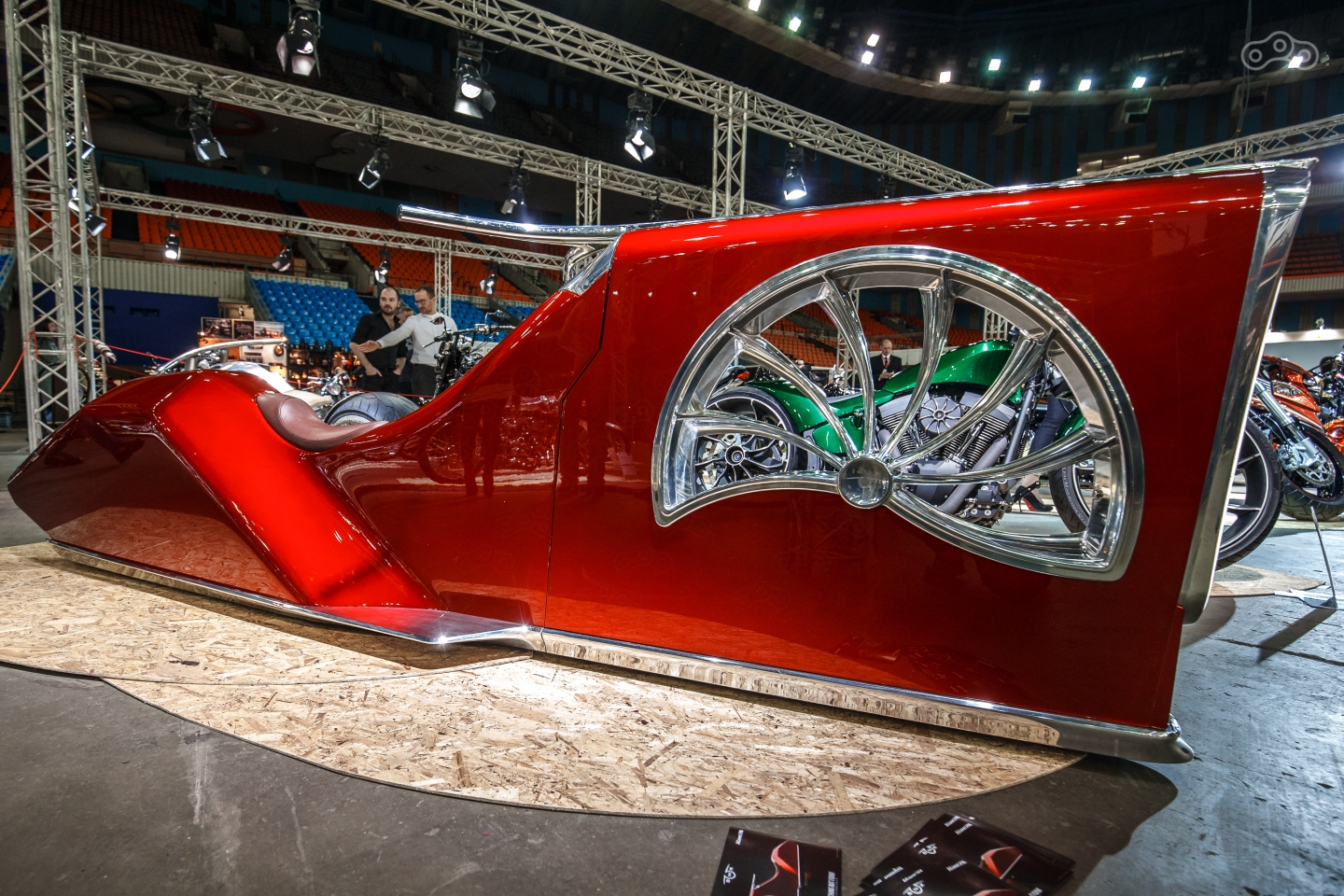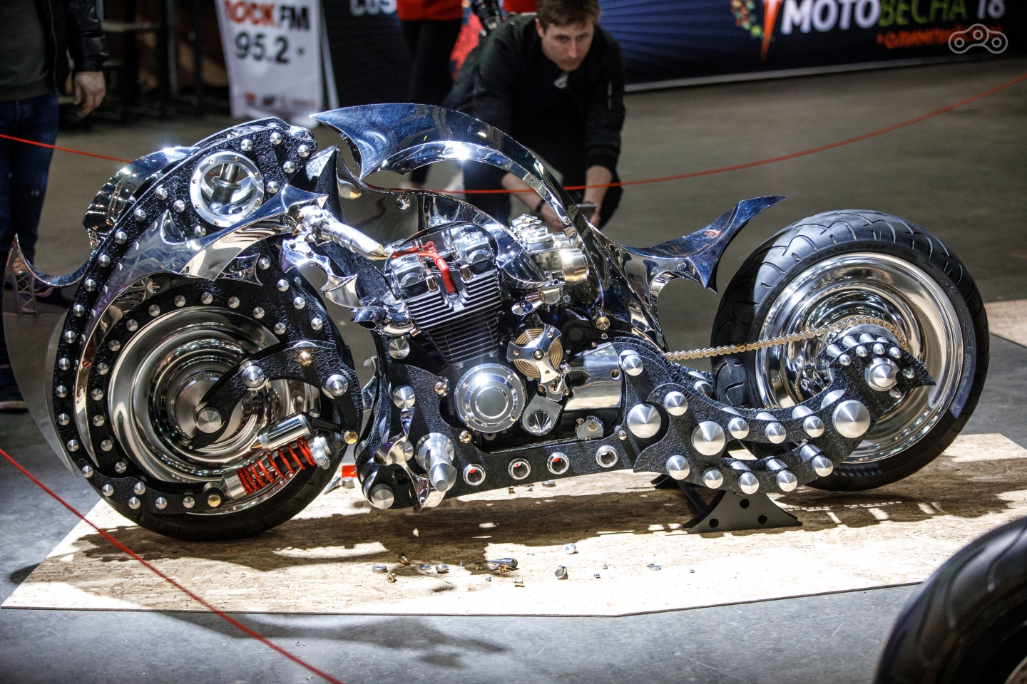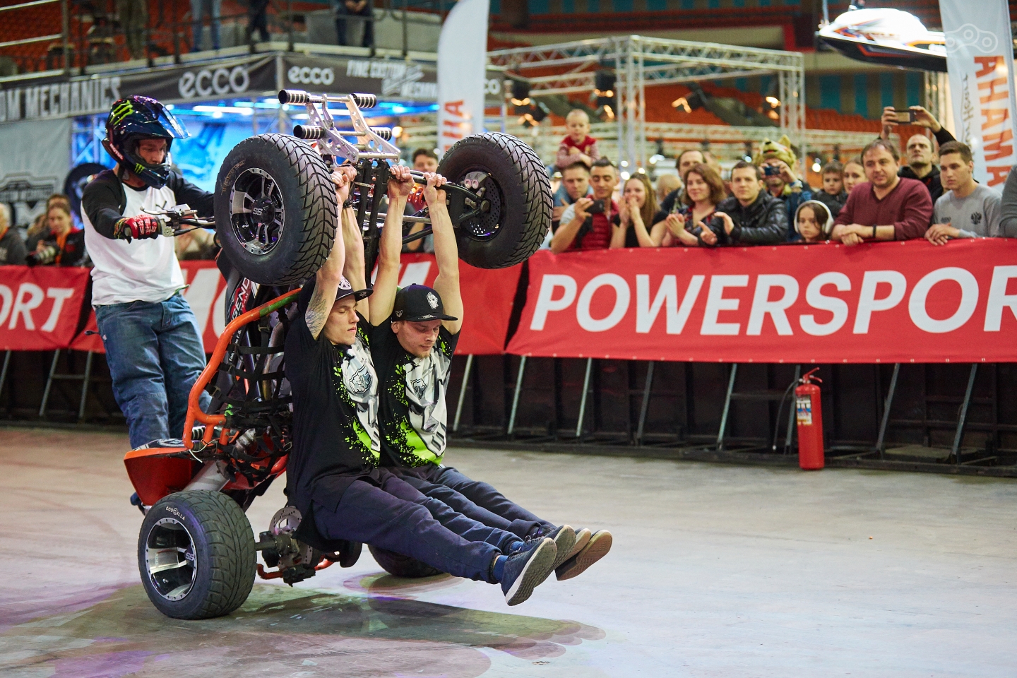 Кастомы – это красиво, но не всегда быстро. Для любителей скорости прямо на арене «Олимпийского» организовали большую спортивную зону Motul Extreme Show, за которой было удобно наблюдать с трибун в перерывах между изучением экспонатов. Фристайлеры прыгали с огромной рампы через весь зал, взлетая под потолок. В перерывах между трамплинами показывал трюковое квадроциклетное шоу Григорий Талдыкин с двумя пешими акробатами.