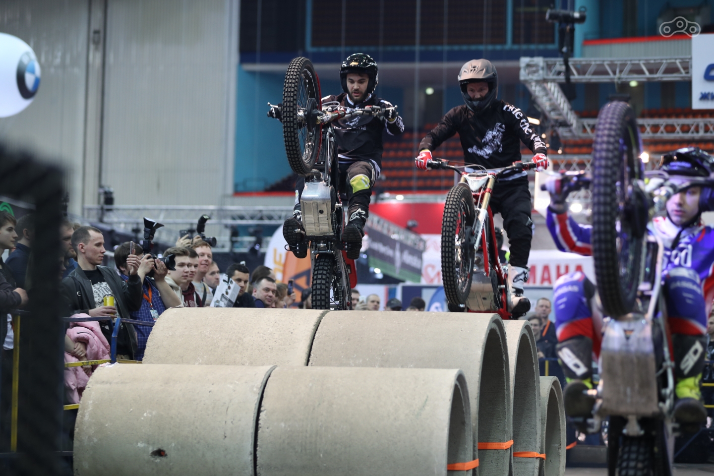 По-настоящему свежее зрелище привезли фрацузские триалисты Жюльен Дюпон, Кенни Томас и их российские коллеги, Александр и Антон Фроловы. Всемирно известные спортсмены выступали на трасе из бетонных колец, сварных металлических кубов, морского контейнера, грузовых колес и трамплинов, перепрыгивали через лежащих людей, крутили сальто и соревновались в скоростном прохождении препятствий, так что в шоу был и состязательный момент.