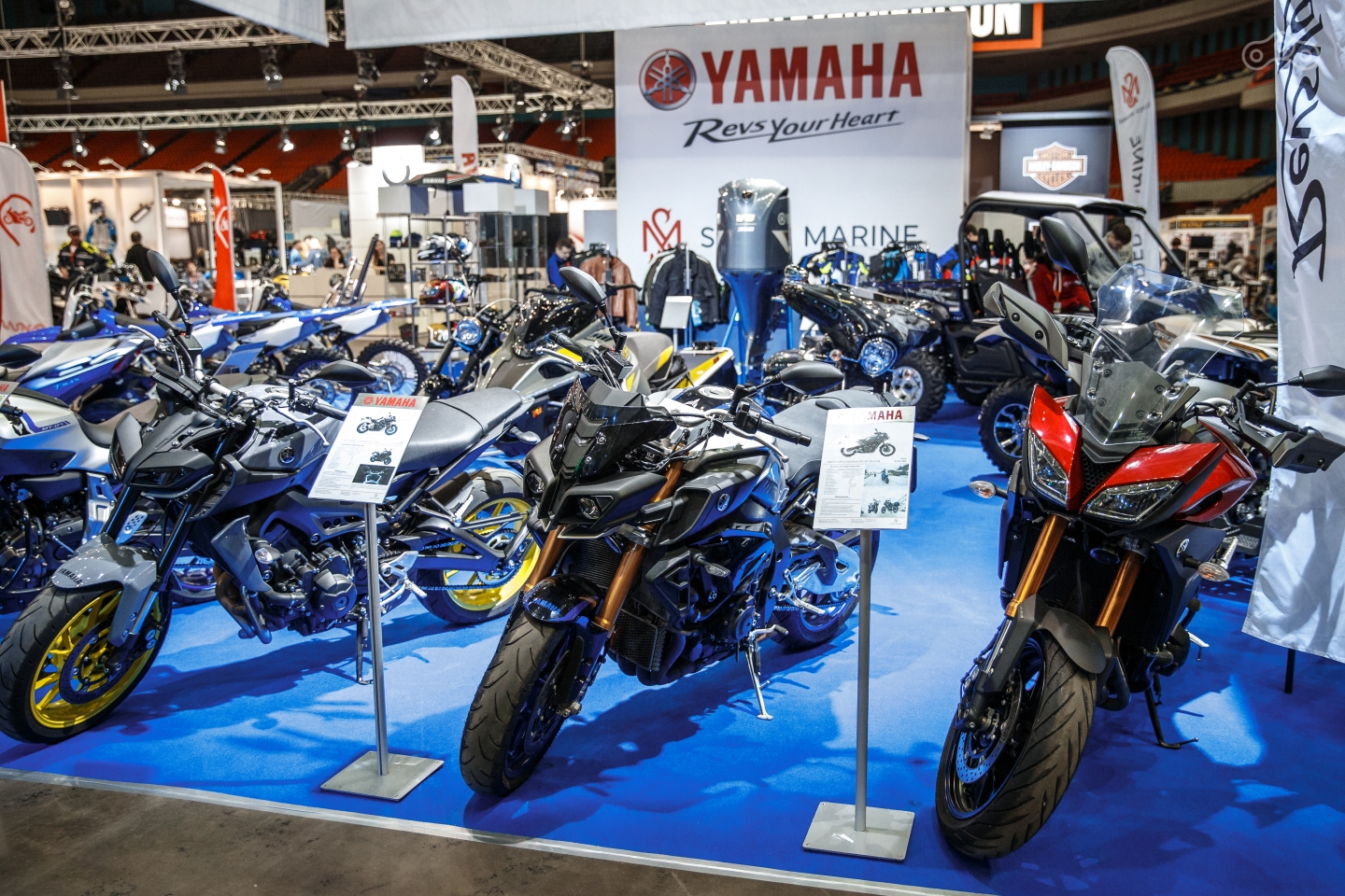 В центре стенда Kawasaki стоял турбированный Ninja H2 и большая линейка более доступных моделей. У Yamaha больших премьер не было, зато был представлен широчайший ассортимент техники для всех условий и сезонов: мотоциклы, квадроциклы, гидроциклы, снегоходы. Большие стенды с последними новинками подготовили KTM и Bajaj.