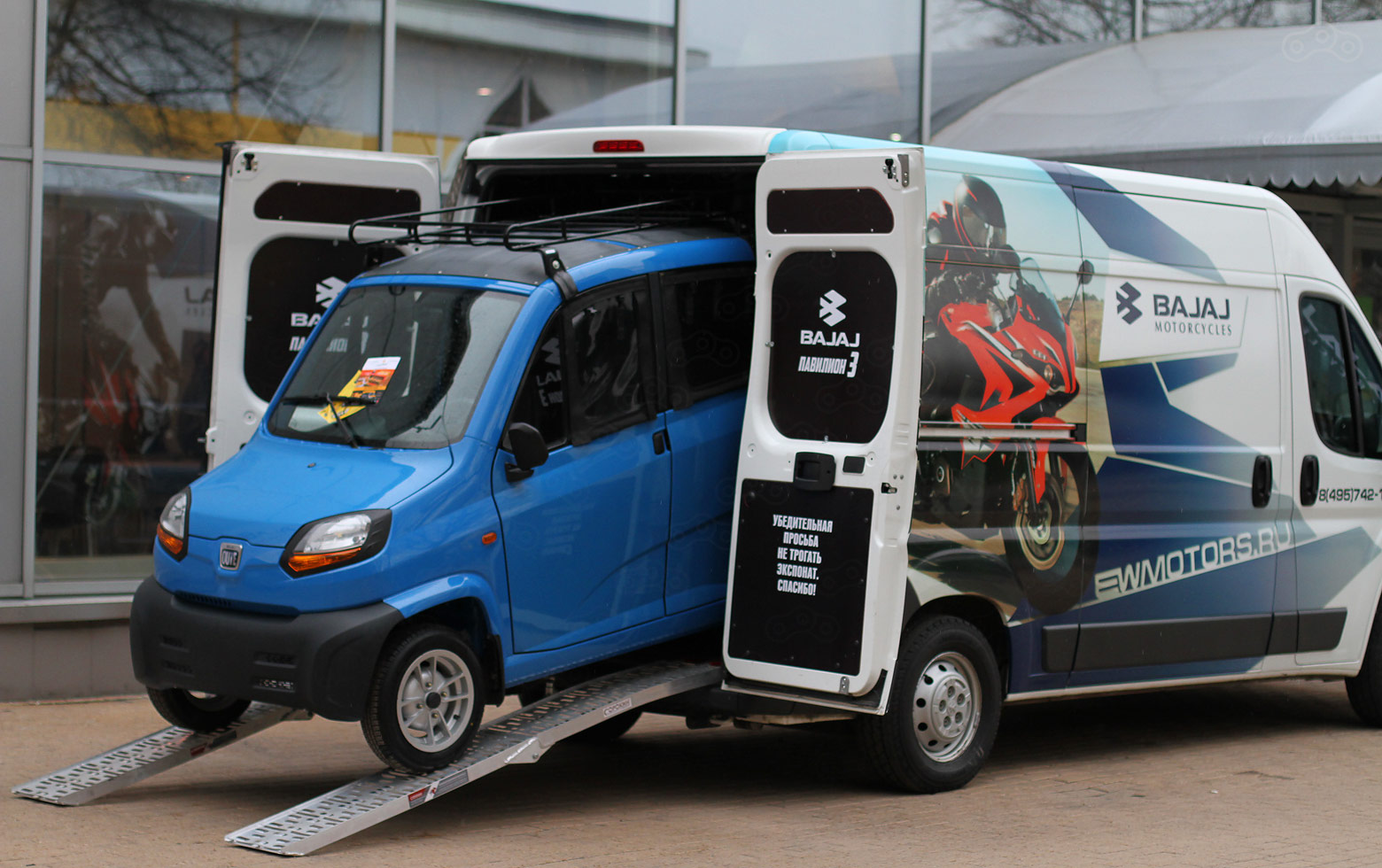 «Антикризисный» автомобиль от компании Bajaj эффектно выкатывается из фургона Peugeot Boxer