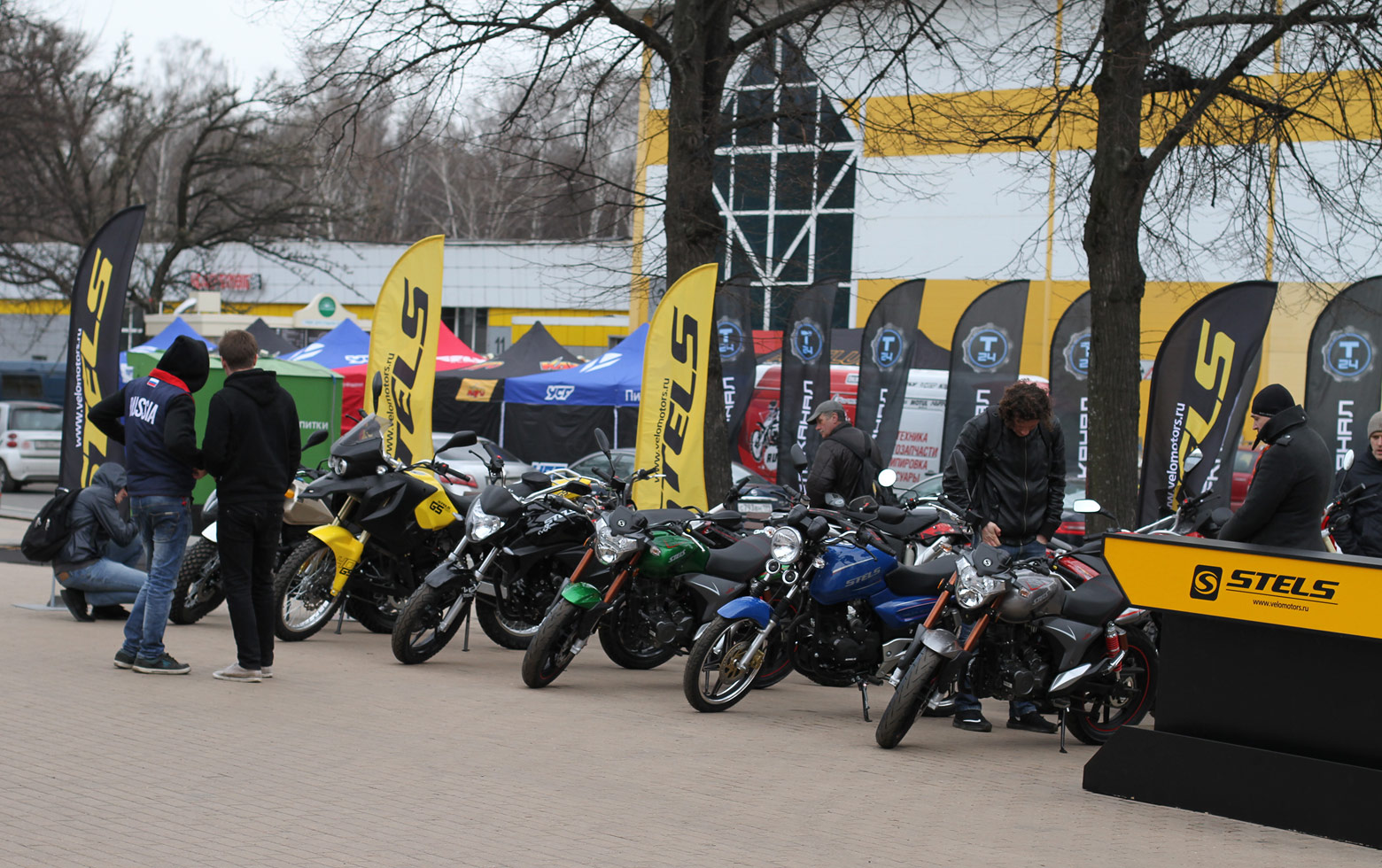 Дилеры Stels, в надежде на хорошую погоду, выбрали скромное, но самое проходное место на улице. Побывав по разу в каждом павильоне – мимо «Стелса» пройдешь дважды. Остаётся надеяться, что после пятничного ливня у российско-китайских мотоциклов ничего не отклеится.