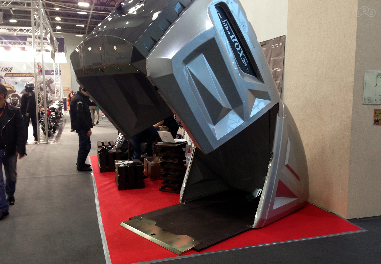 Заметным элементом выставки стал инновационный мотогараж от компании BikeBox24. Гараж-трансформер на анкерах, с фиксатором переднего колеса – интересная и достойно реализованная концепция. Однако есть опасение, что в российских реалиях такой красивый гараж могут украсть вместе с мотоциклом.