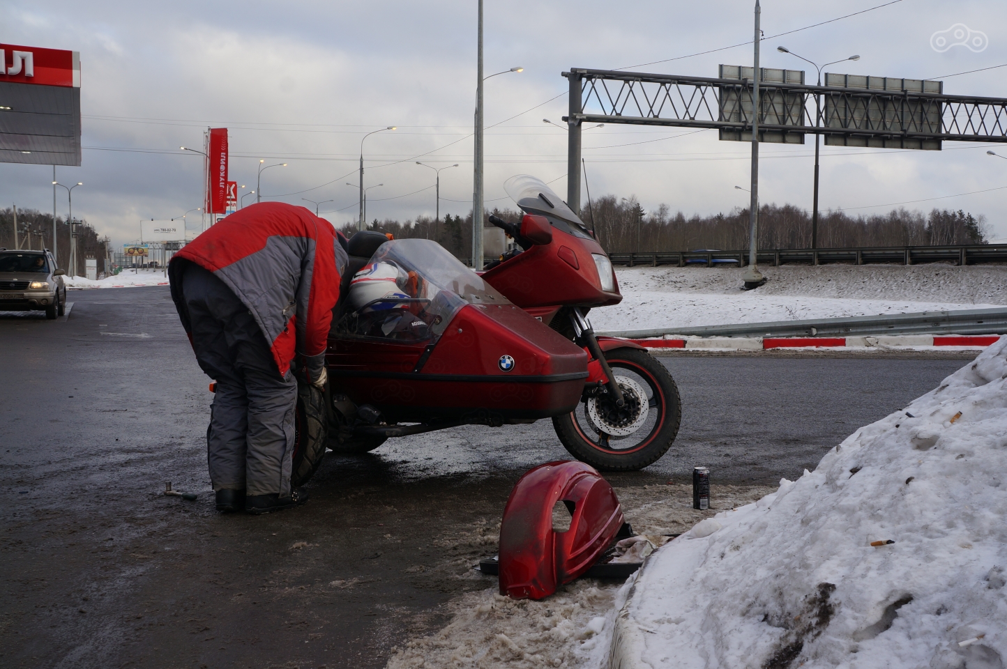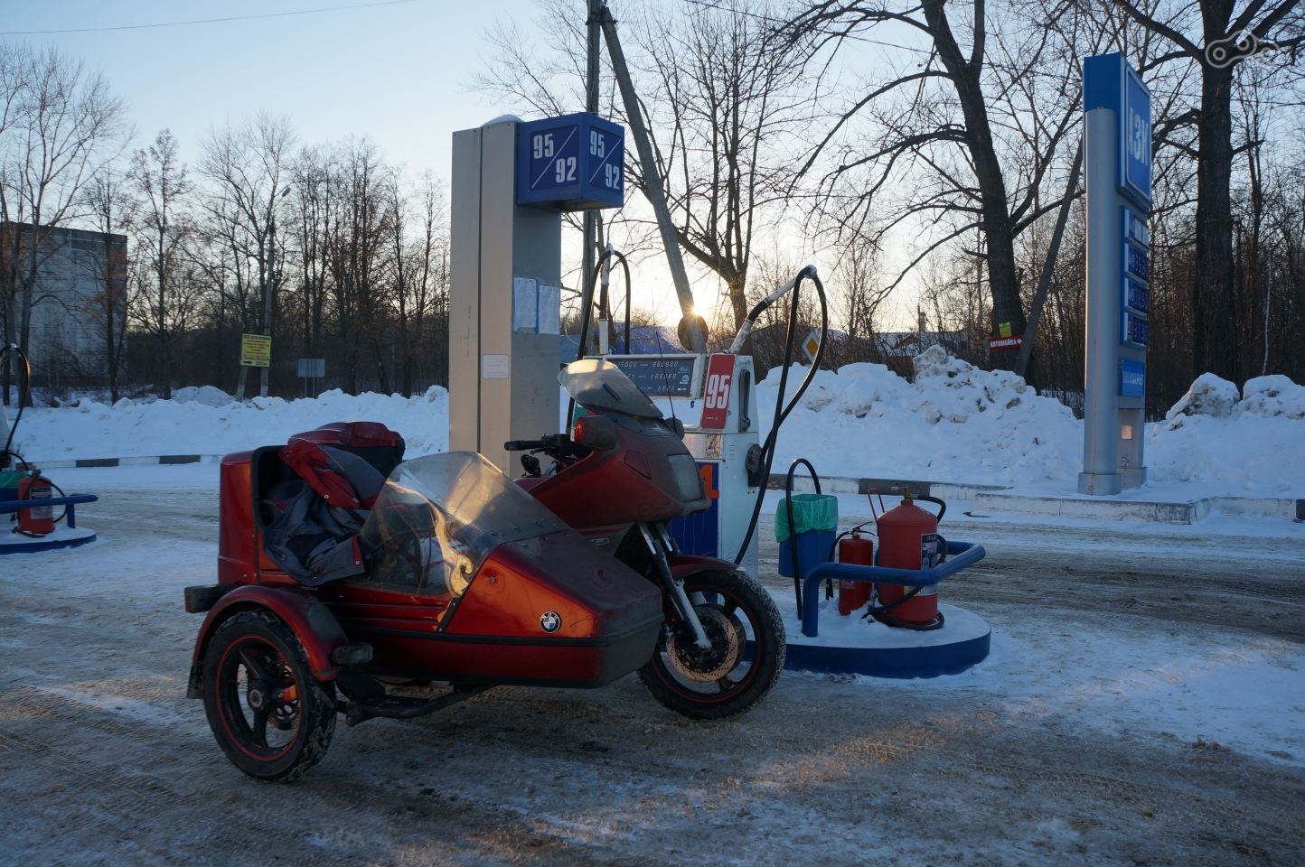 А вот и поселок Грицово! Заправка со страшными пистолетами, асфальт. С накачкой колеса решили повременить и по асфальту ехали тихонечко, а через четыре километра увидели ту самую стелу, «Грызловский разрез» собственной персоной! Фотографировать ее не было ни сил, ни времени, смеркалось, а мы еще до «Самовара» не доехали. И снова в снег, который баварский мотоцикл наверняка ни разу не видел за всю свою 25-летнюю жизнь.