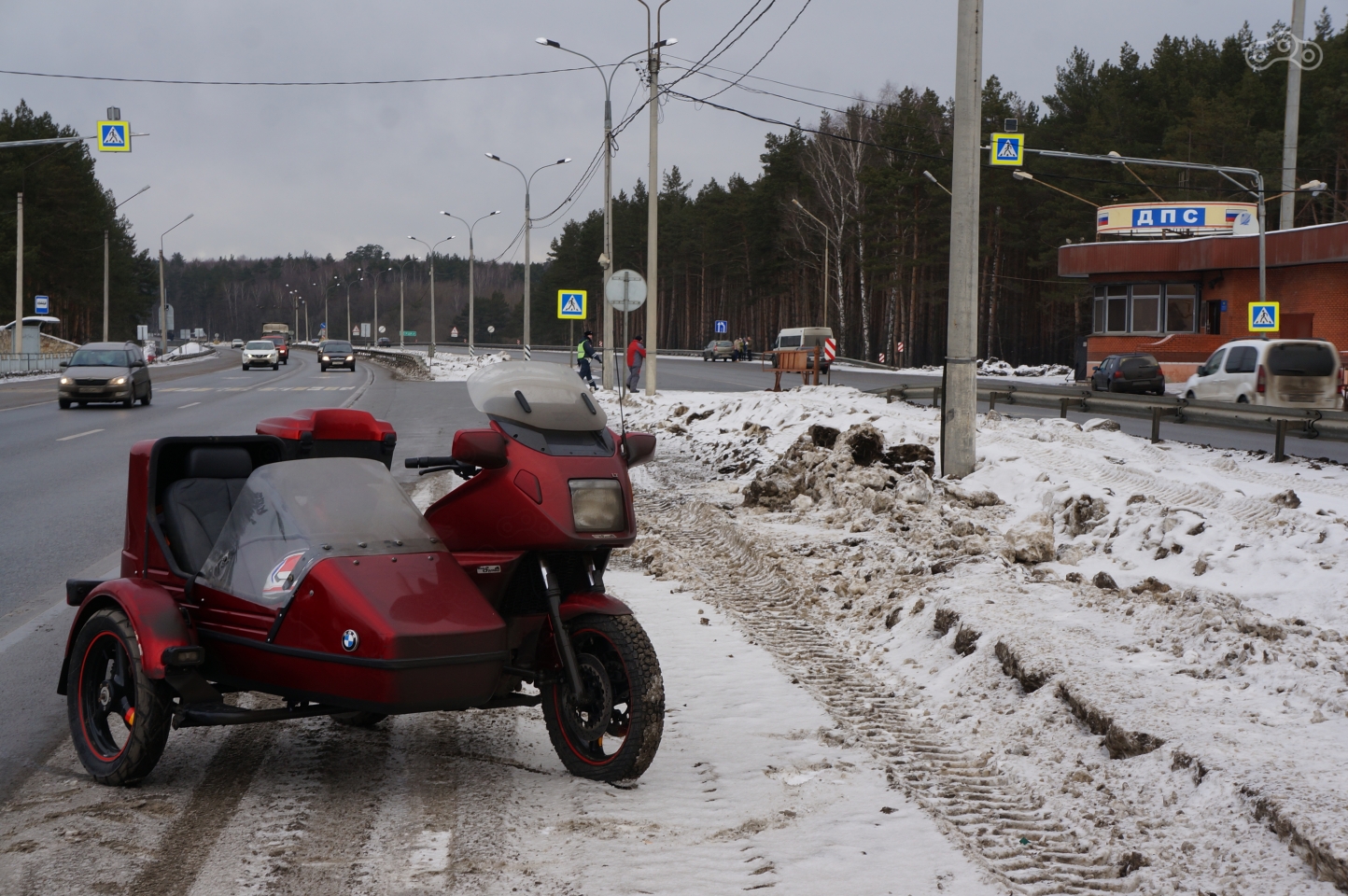 Впрочем, «наматывать круги» сказано слишком уж громко – дороги с укатанным снегом и льдом в сочетании с четырёхсоткилограммовым колясычем, обутым в летнюю резину… Стометровый спуск к мосту и взятие такого же подъема заняли минут двадцать. Вниз мотоцикл съезжал, несмотря на три заблокированных тормозами колеса, очень даже охотно, хоть и не очень контролируемо, а вот вверх…