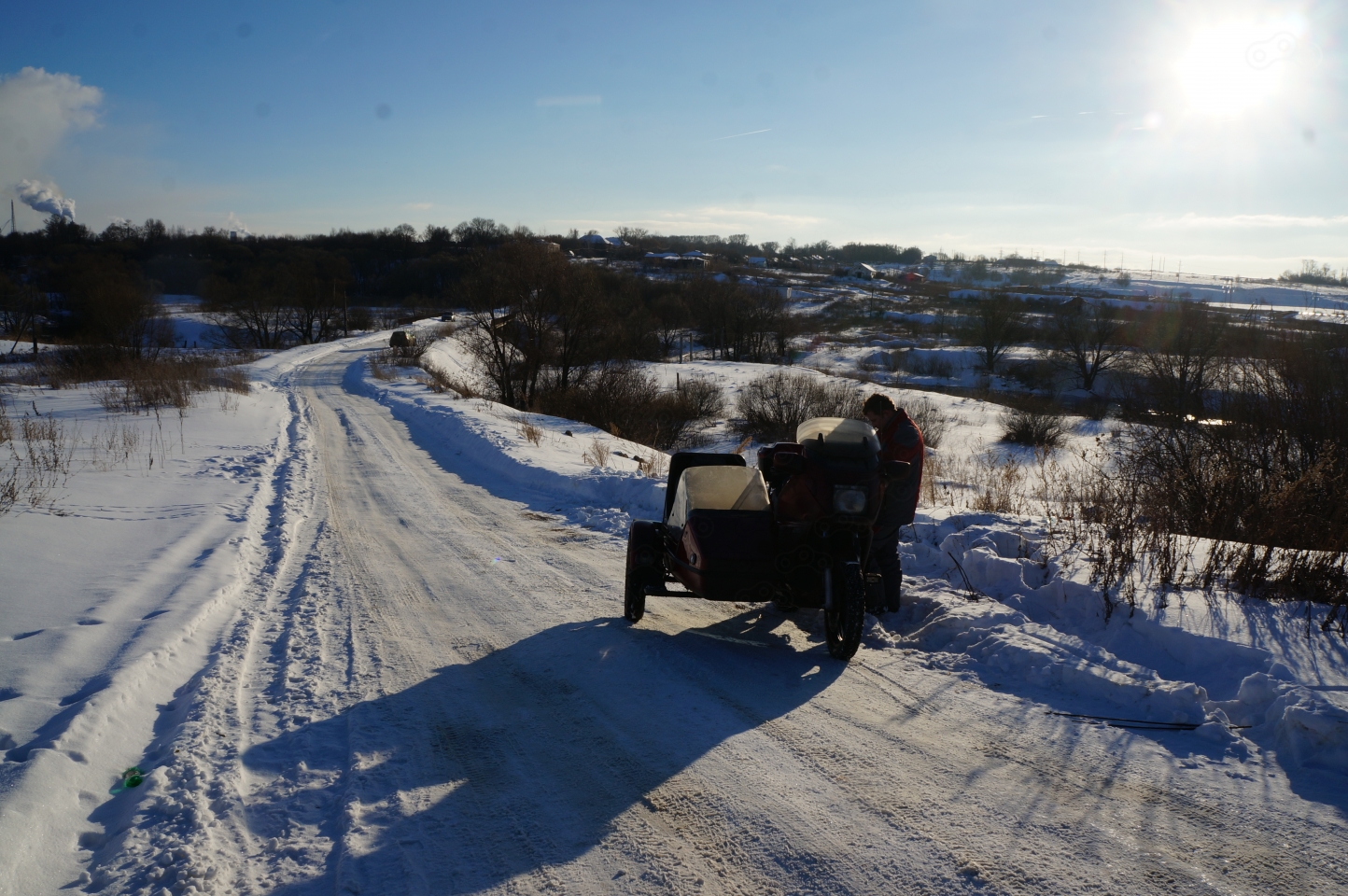 «Сейчас я вас туда подтолкну, а дальше вы и сами доползёте». Разгон, снег под брюхом, беспомощная шлифовка льда задним колесом, но втроём мы всё же смогли втащить мотоцикл на пригорок. Оказалось, что это только начало, хотя мы, в общей сложности тащившие сегодня колясыч на себе едва ли, не столько же времени, сколько он нас вёз, даже не удивились.