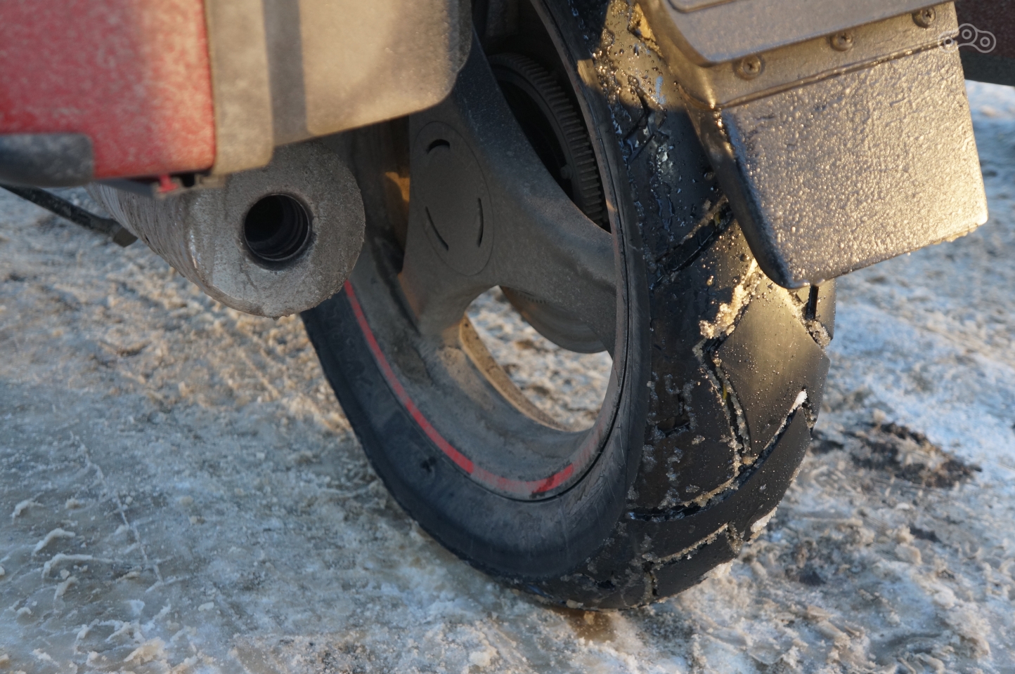 Подспущенное колесо помогало штурмовать ледяные подъёмы, но без шипов, толку от него всё равно мало.