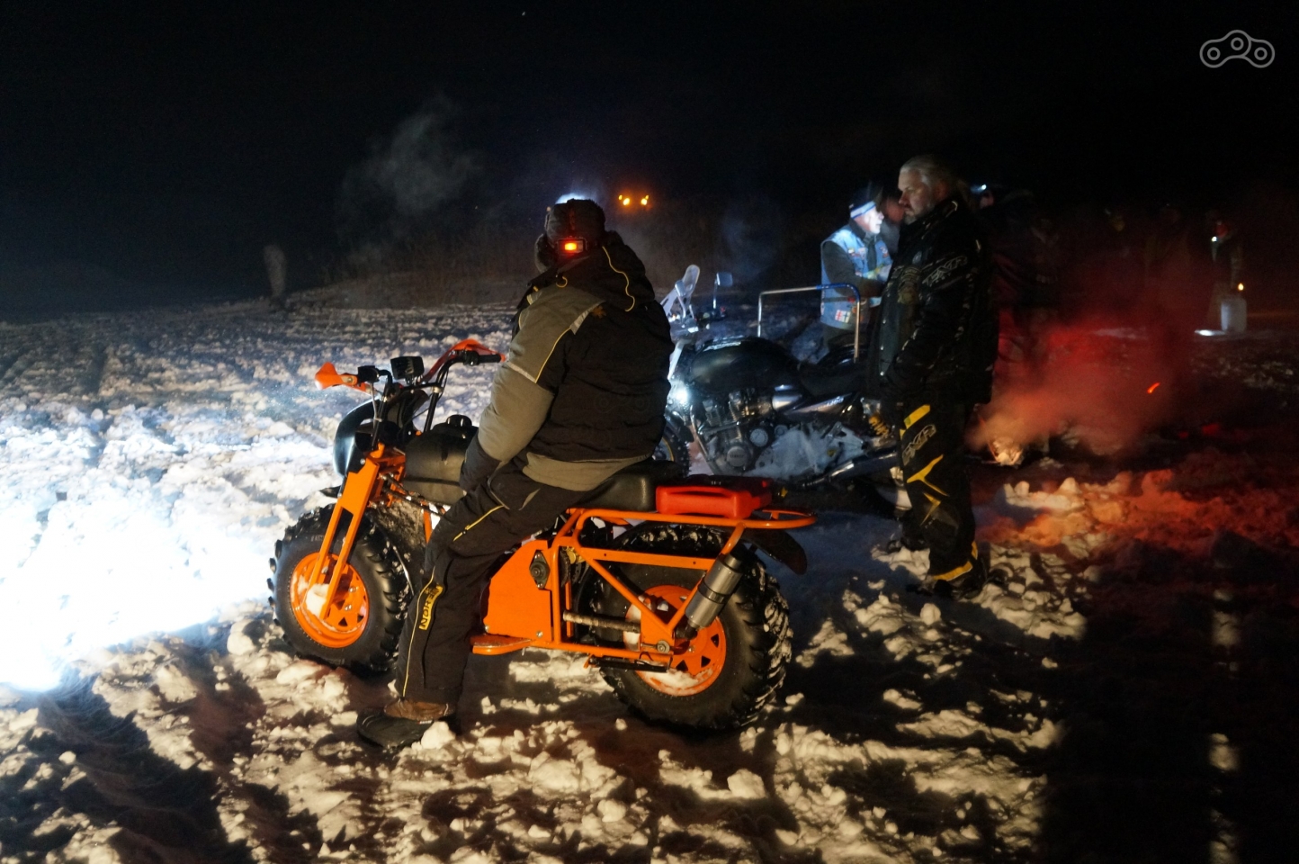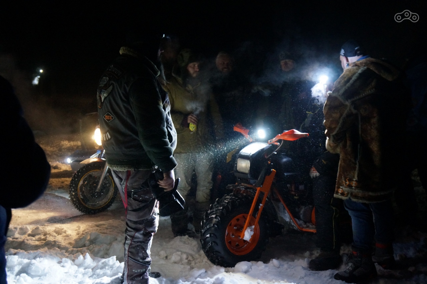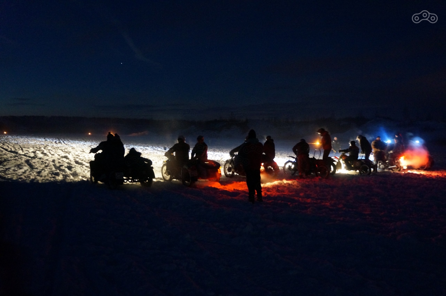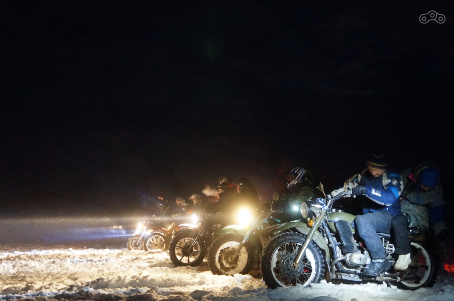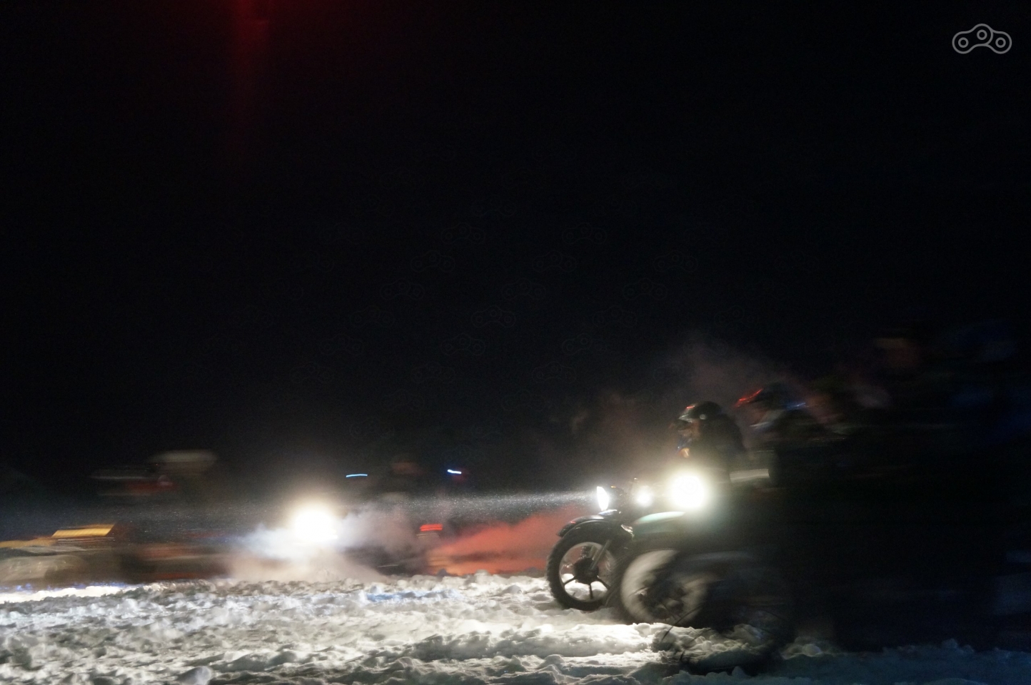 Зрелище завораживает – старт под выстрелы, озаряющего небо и замерзшее озеро салюта, брызги снега, выхваченные светом фар, рёв моторов и яркие прожекторы болидов, то светящиеся где-то на горизонте, то ослепляющие и проносящиеся мимо всего в паре метров. Ради такого, определенно, стоило весь день тащить мотоцикл на себе!