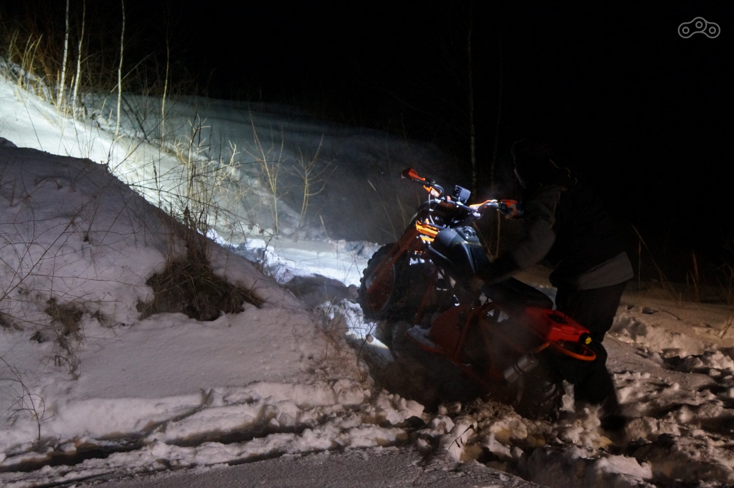 Колесо тщетно буксовало, мы кое-как толкали мотоцикл, но в какой-то момент скользить начали даже подошвы снегоходных сапог. Просить о помощи было некого, пот лился ручьями, дышать тяжело, но с горем пополам вытащили.