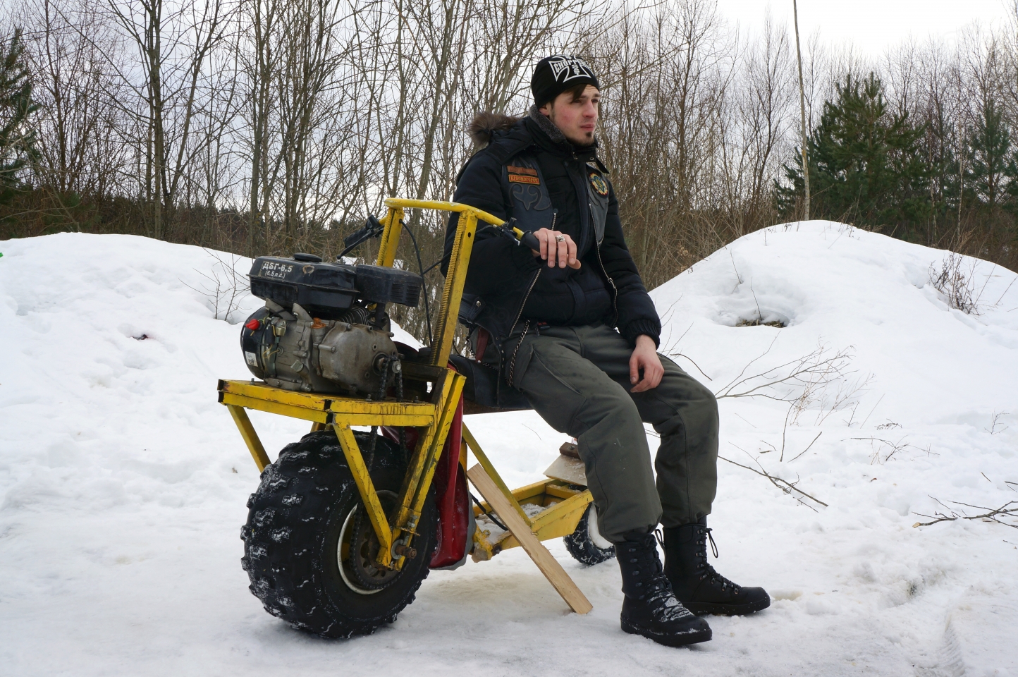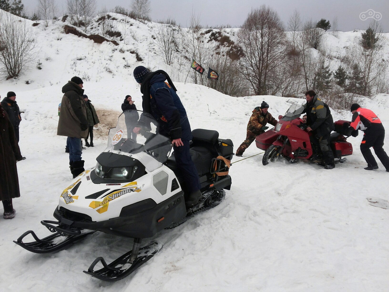 Галстук в руки и на поклон к хозяину снежика, который, естественно, не отказал. Представьте, насколько наш колясыч непригоден для оффроуда, что даже тяжёлый утилитарный снегоход, рассчитанный на внушительного размера сани, буксовал, вытягивая нас наверх. Но обошлось, и минут через пять сайдкар уже стоял на твердой и ровной поверхности, дотянув нас до дома без приключений и проблем.