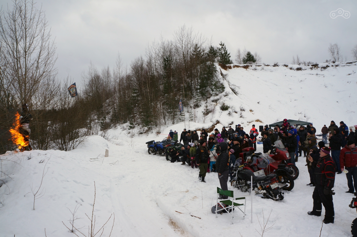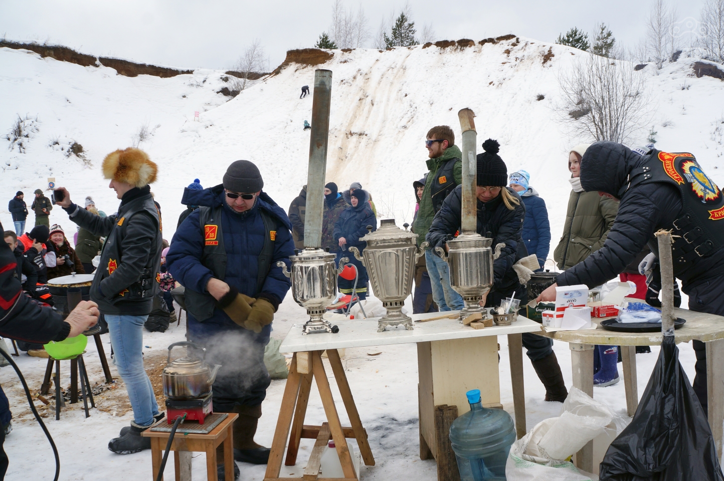 В карьере нас встретили члены клуба «Русский Рассвет» и сходу пригласили к столу с горячим чаем, согретом в настоящих дровяных самоварах и блинам, масленица жеж!