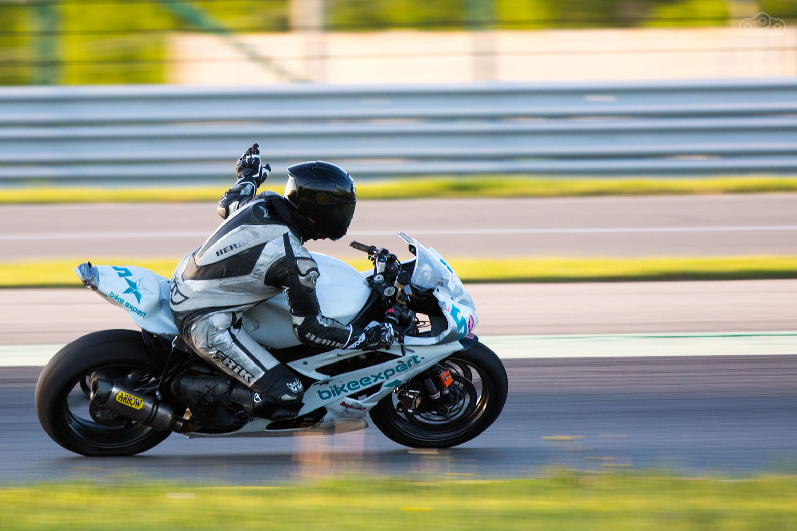 Участник заезда российского «супербайка» приветствует зрителей чемпионата