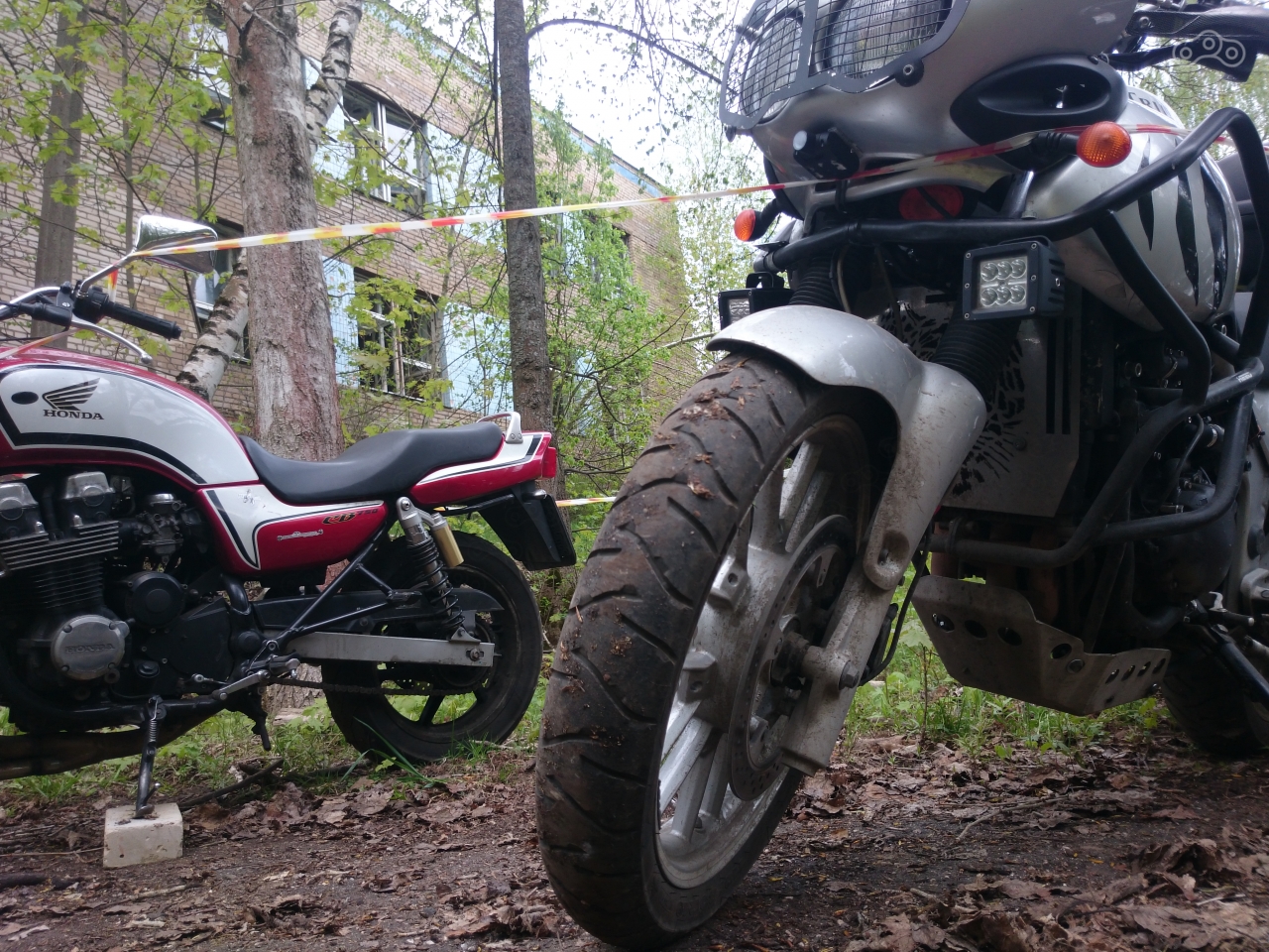 Как результат, мы регулярно собирали «хвостик» из более расторопных мотобратьев. Уважаемые мотобратья! Обращаюсь к вам, пользуясь моментом! Ну видите вы медленный гружёный мот — ну бикните вы пару раз коротко! Я же не по зеркалам смотрю, а вперёд — чтобы не перестроился в меня никто, чтобы не зацепить угловатым металлом чужое авто. Мне не трудно, я сдвинусь в полосу как сдвигался каждый раз как замечал что за нами «хвост». Но нет, не слышат братья, лезут в соседний междуряд, обходят там нас, пугая авто. Нас реально обматерил водитель фуры, на моих глазах крутанувший руль 3-4 раза в разные стороны — я-то не лезу, мало ли чего он там рулит, а он и в левом и в правом зеркале мотоциклы видит, вот и занервничал человек.