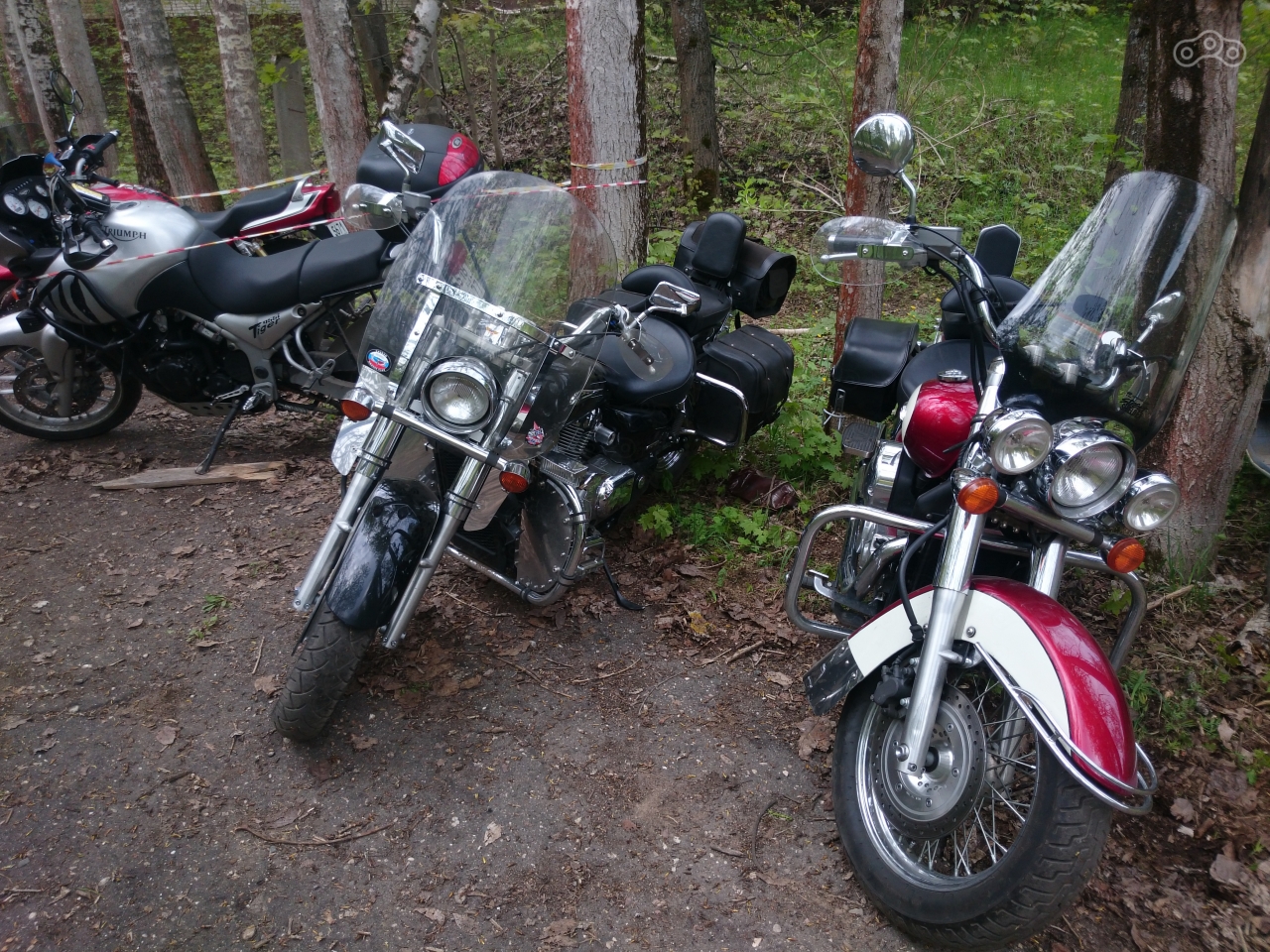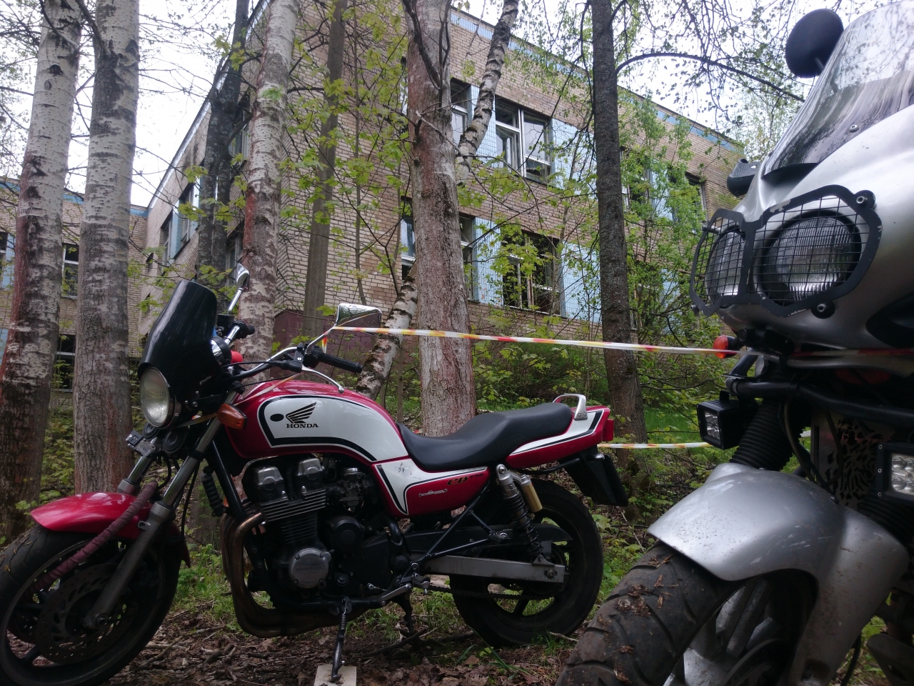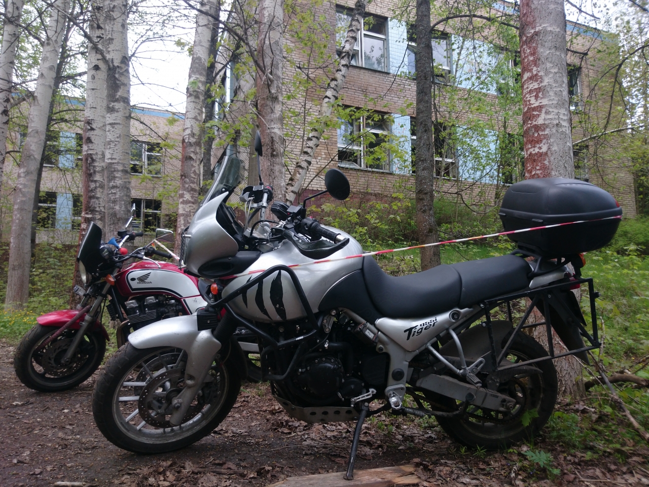 Выехав в субботу, мы попали в типичную пробку. Первым — я на Триггере (это у моего Tiger 955i прозвище такое, я об этом писал) с ящиками, за мной — сибиха товарища. Поскольку ящики у меня самодельные и защитным конструктивом не обременены, снять походя лакокрасочное с чей-то легковушки ничего не стоит, а вес пассажирки и килограмм 20 груза (из которых 12 только вода) ввиду отсутствия существенного опыта рулёжки (в смысле гружёная турында, яж только поменял класс весной) тоже не добавляли скорости.