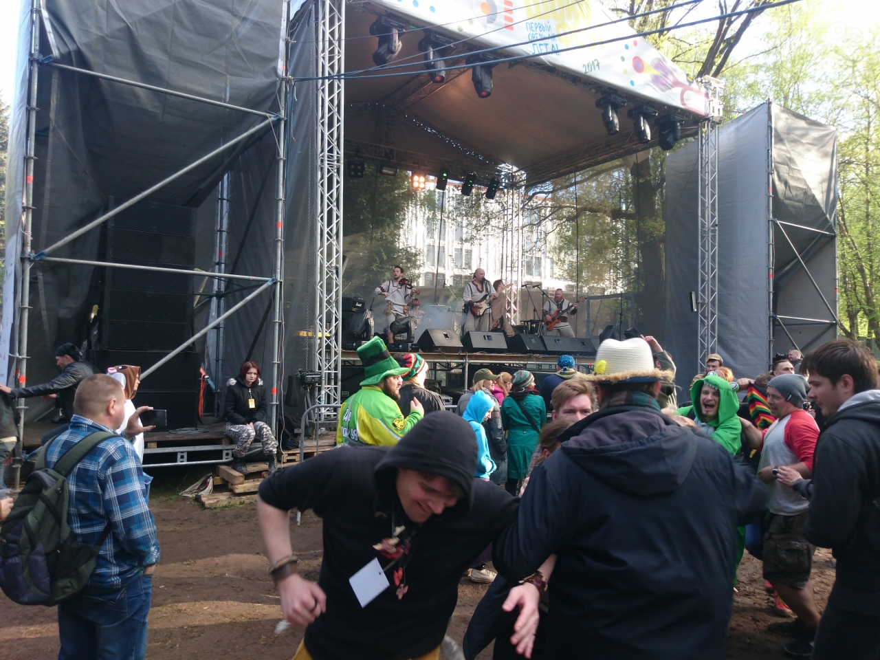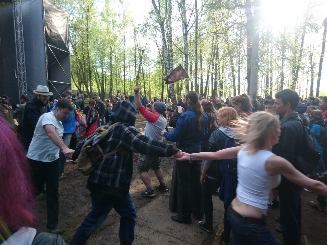 Кстати эти ребята мало того что вплетают в песню название феста, так ещё и делают неожиданные каверы. А народ на полном серьёзе и с энтузиазмом водит хороводы. Точнее - бегает их.