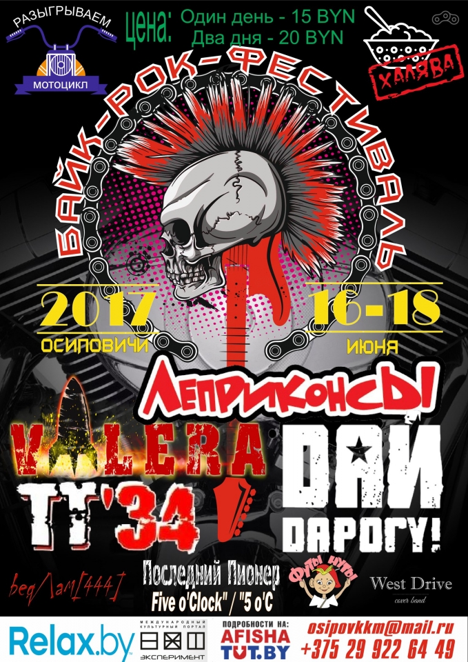 Музыкальную часть обеспечат такие музыкальные коллективы как «Дай Дарогу», «Валера», «Футы Нуты», «ТТ-34», "Леприконсы", много кавер-исполнителей, а также развлекательное шоу. Также в конкурсной части мы определим «Мисс мото 2017», «Ретро Мотоцикл 2017», «Кастом 2017», «Самое красивое тату», "Самый дальний гость" и т. д. Разыграем ЛЕГЕНДАРНЫЙ МОТОЦИКЛ, бесплатно угощаем армейской кашей и чаем. Организаторы фестиваля постоянно ведут работу над программой и за её изменениями и дополнениями всегда можно проследить на официальной страничке https://vk.com/1moto_by
