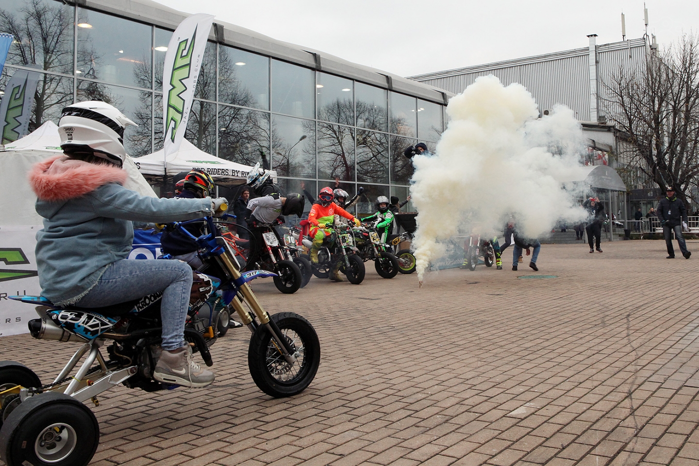 Если вы уже были на «Мотозиме 2016» или «Мотовеснe 2017», то наверняка знаете, что перед павильонами традиционно можно встретить стантрайдеров всех мастей. Приехали они и в этот раз, правда, помимо традиционных мотоциклов и пит-байков, в нынешнем году увидеть можно было ещё и трайки, задние колёса которых были вставлены в обрезки пластиковых водопроводных труб.