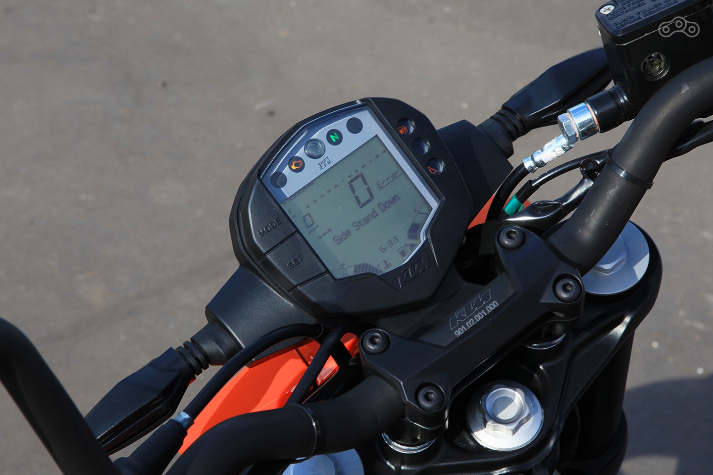 Всё просто: несмотря на то, что «чекушка» построена на новом для всего семейства шасси, в мотоцикле есть ряд упрощений, на которых удалось сэкономить, тем самым снизив стоимость и сделав Duke 250 доступнее. Скроили на электронике – например, приборную панель оставили старой, с маленьким монохромным монитором. Ленточный тахометр, мелкие цифры, но функционал, тем не менее, не плох – помимо температуры мотора и остатка топлива, панель расскажет о выбранной передаче, расходе и прочих важных параметрах.