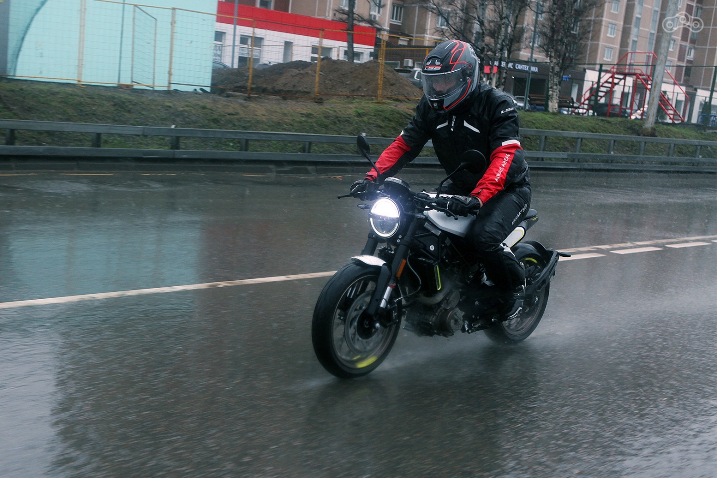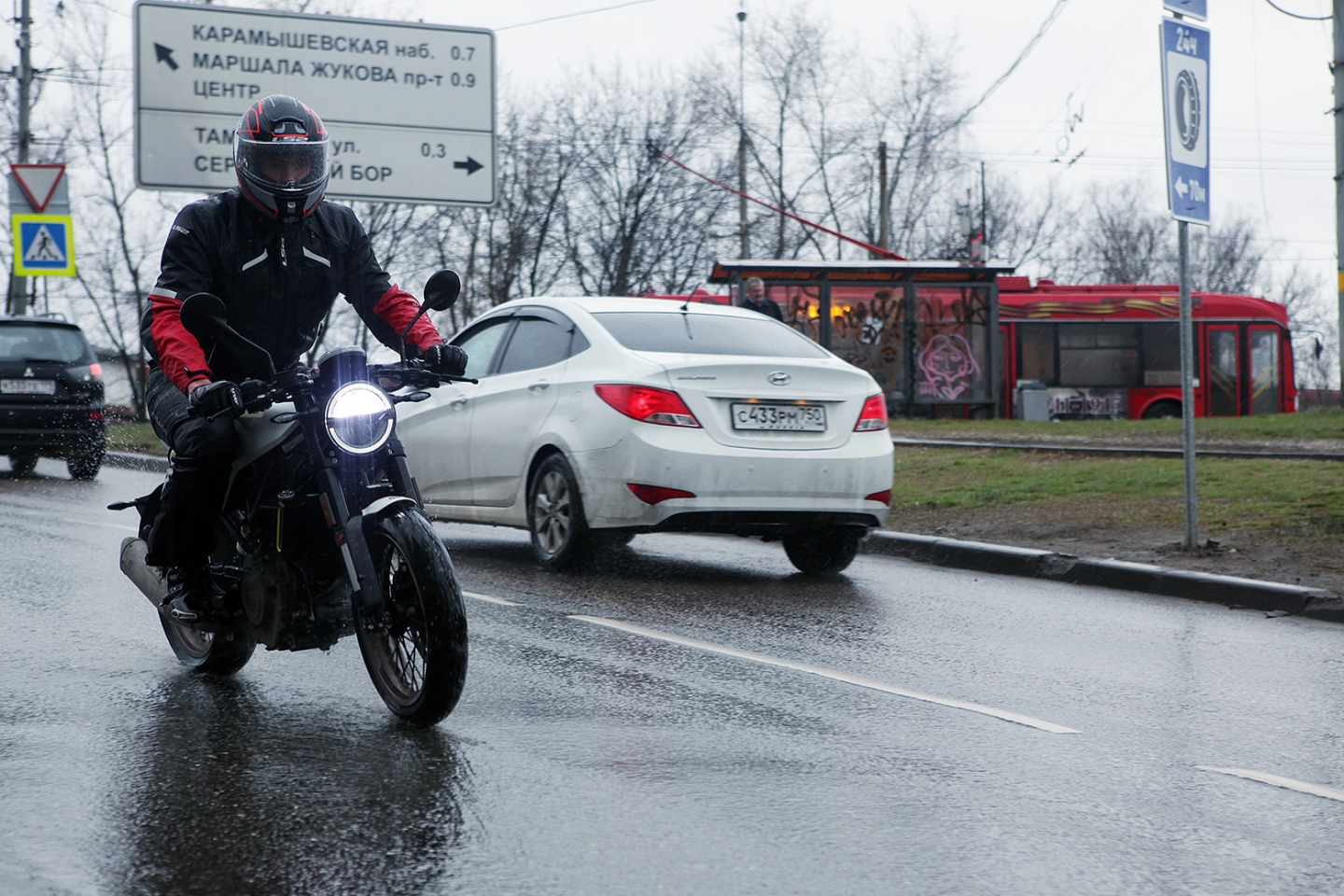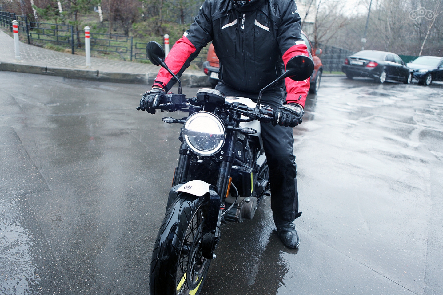 Зато огромные круглые зеркала могут похвастать лучшей обзорностью в классе, и, несмотря на близкое расположение к лицу райдера, помогают великолепно ориентироваться в потоке. Ветрозащиты нет от слова «совсем», да и брызги, пробиваясь через красивое заднее крыло, долетают до спины, но для городского мотоцикла это нормально. Куда важнее переработанные настройки мотора!
