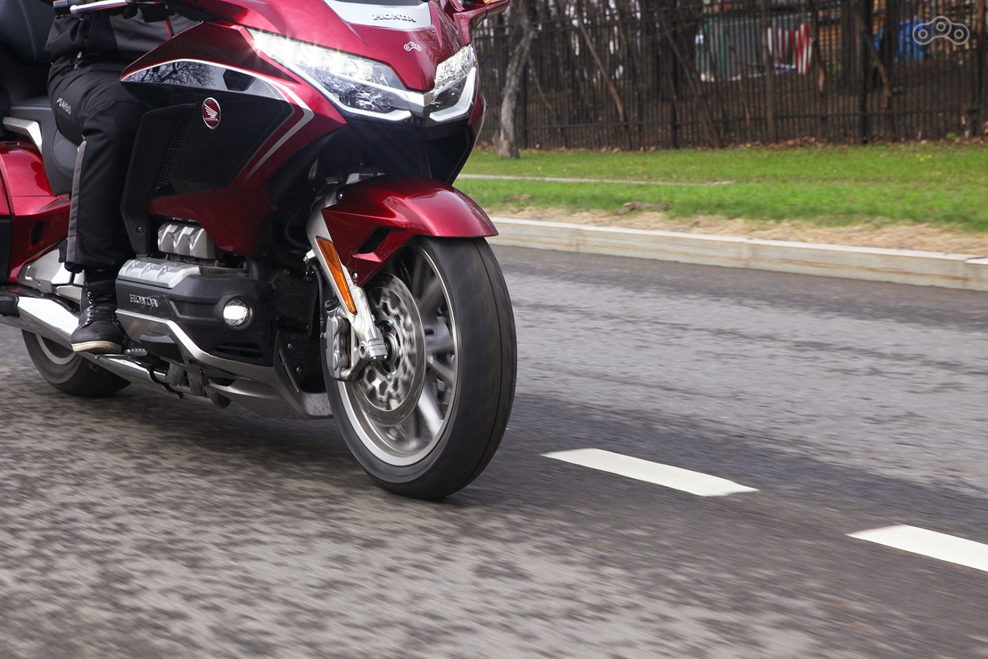 Honda Gold Wing 2018 Tour DCT совершенно не ощущается 400-килограммовой махиной – спасибо низкому центру тяжести, даже на маленькой скорости маневрировать можно играючи, выставляя ноги в самый последний момент. И это, на мой взгляд, одно из главных достижений, сделавших аппарат доступнее для людей, физически не справлявшихся с прошлой генерацией.