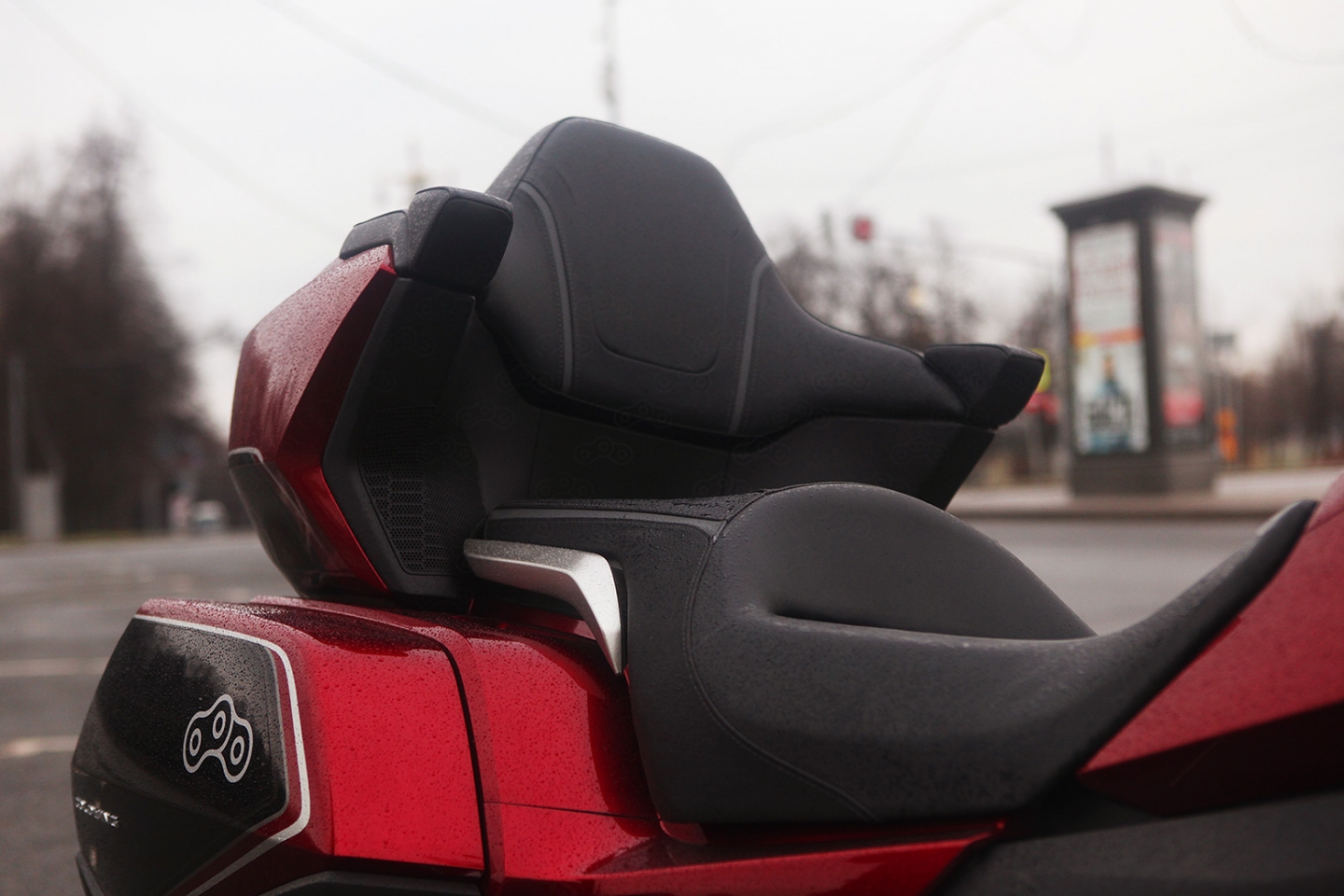 Зато на моторе и глушителях не слишком заметные, но увесистые слайдеры, традиционно стильные подножки, и огромное, удобнейшее седло с поддержкой поясницы с раздельным обогревом. Регулировки высоты, увы, нет, но и без неё посадка близка к идеальной: седло относительно низко, ногами до земли дотянется любой желающий, спина прямая, бак стал уже, а руки расставлены чуть шире колен.