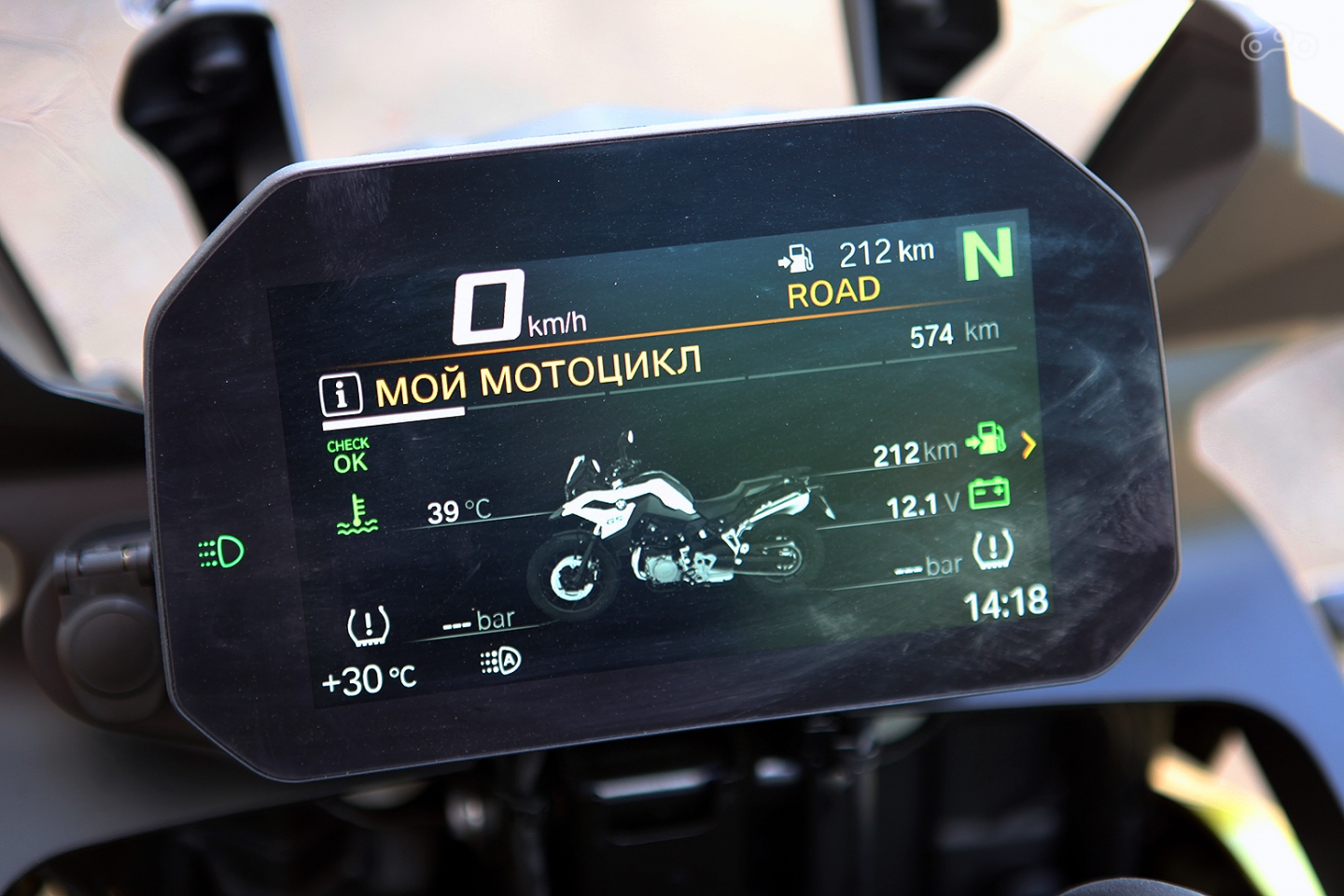 Сама же приборная панель – вершина технологий. Большой, цветной и идеально читаемый под любым солнцем монитор, эталон дизайна, такой же, каким когда-то был iPhone. Похожую панель мы уже видели на KTM 390 Duke, и Triumph Tiger, а лет через десять, стрелки останутся исключительно на премиальных мотоциклах, велкам ту фьюче, земляне! Баварцы же, со свойственной им щепетильностью, радуясь новым возможностям, впихнули в функционал все, что только можно.