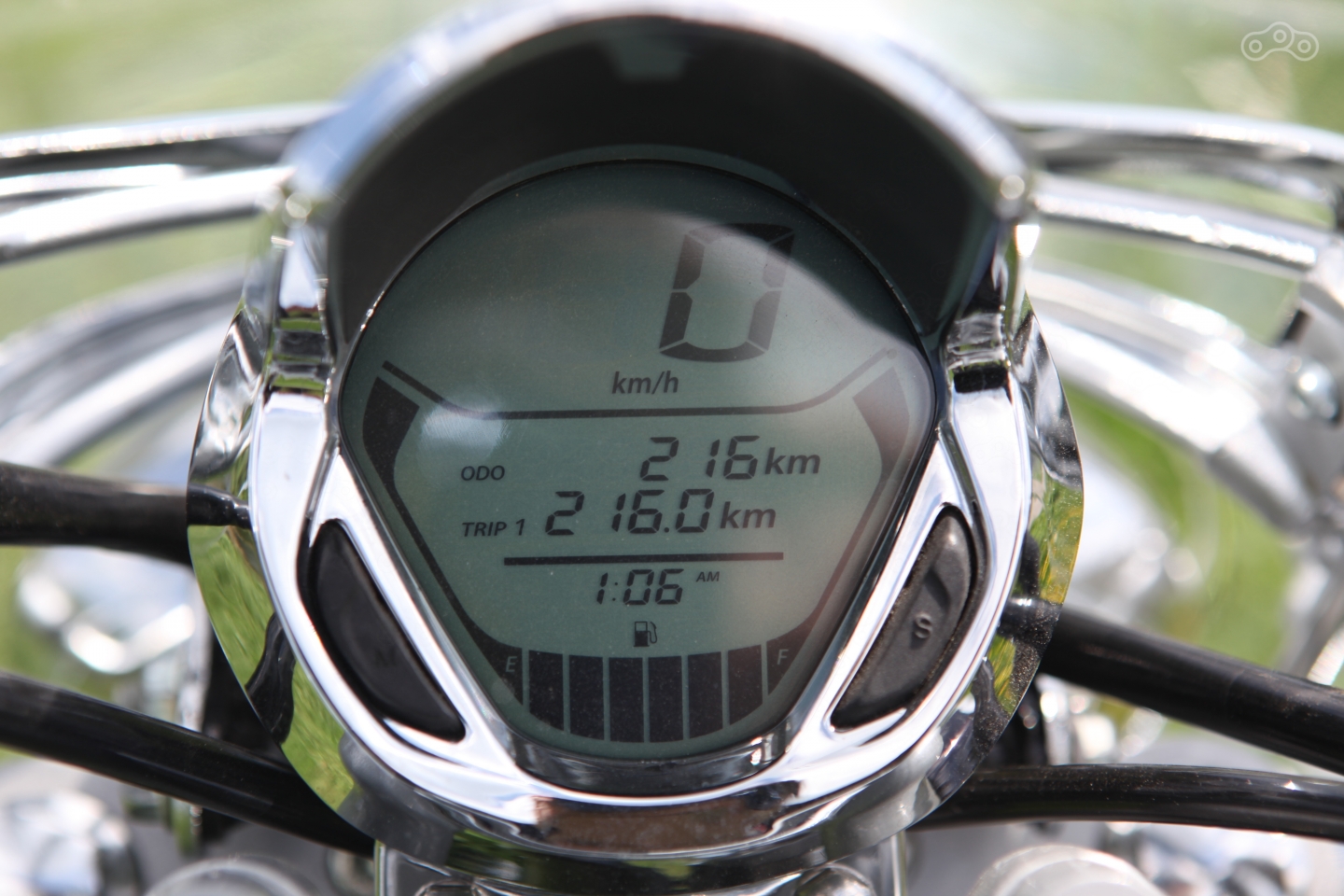 Это же можно сказать и про новую цифровую приборную панель – вместо аналогового спидометра с аналоговым же указателем уровня топлива, теперь круглый монитор с часиками, одометром, спидометром и ленточной шкалой уровня топлива, отображающей погоду на луне. А контрольные лампы переехали на бак – взгляд сюда падает не часто, от чего и про выключение поворотников за рулем постоянно забываешь.