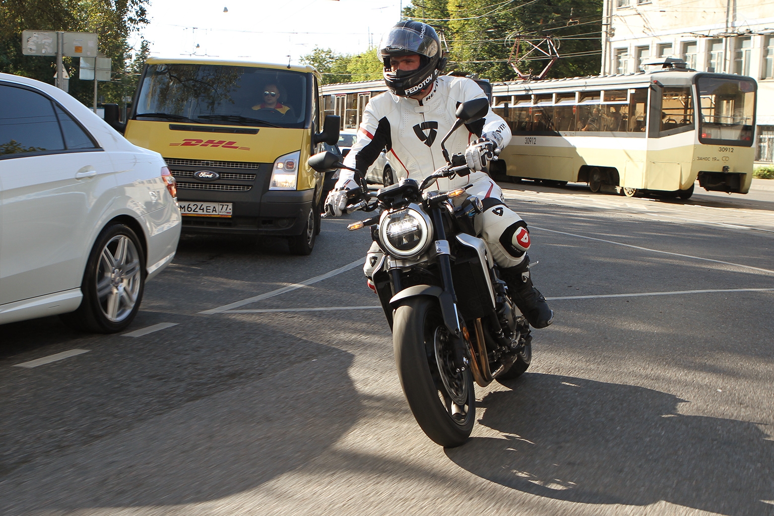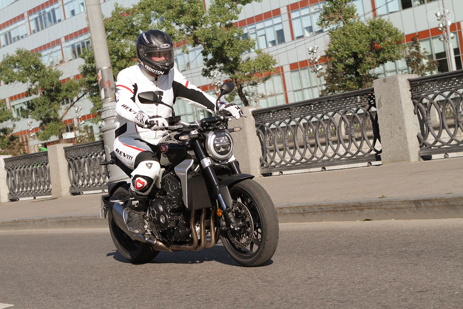 Что же до мотора, то здесь без откровений: прекрасный агрегат перекочевал сюда с флагманского спорта, растеряв по пути кучу лошадей, зато нарастив жирка в середине. Хоть 146 кобыл и укороченные передачи срезали максимальную скорость, зато улучшившие динамику. По заявлению «Хонды», разгоняется до 130 CB1000R лучше, чем CBR1000, и в это охотно веришь, особенно наблюдая цифру 150 на спидометре, выкручивая вторую передачу с уже переставшим вращаться в воздухе передним колесом.