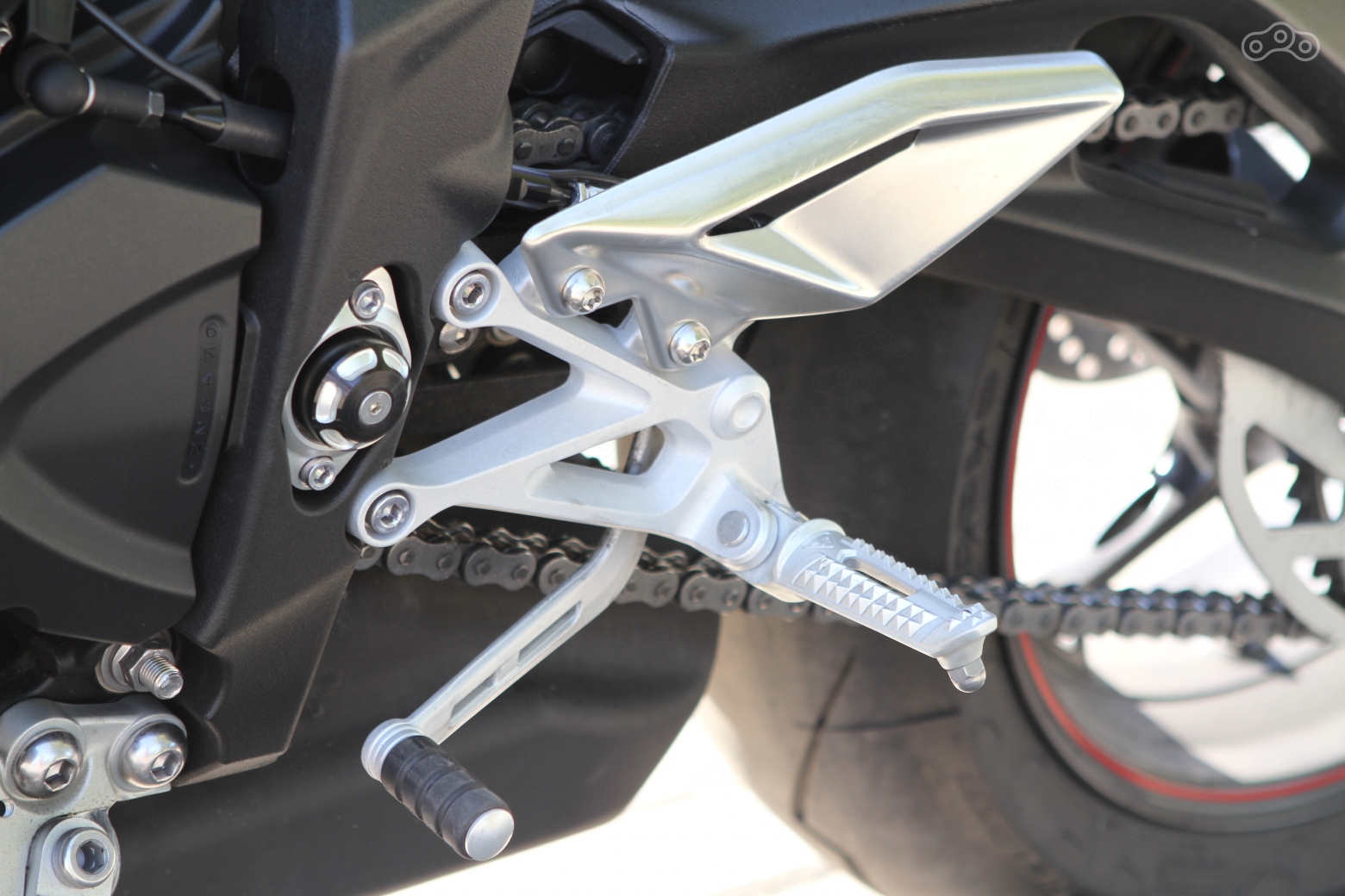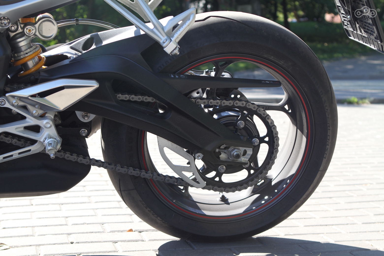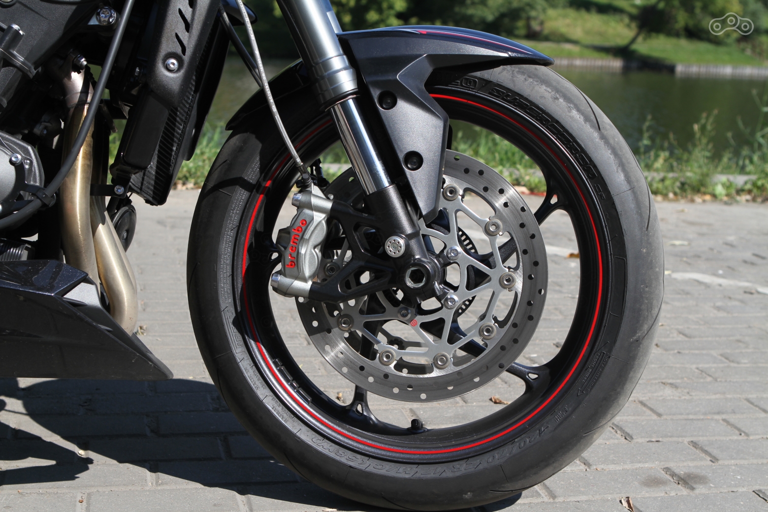 Впрочем, какие могут быть дамы, когда у вас фактически спортбайковское шасси, напоминающее Triumph Daytona, топовые тормоза, отличные подвески и 123-сильная «тройка» между ног? Не дайте себя обмануть, 123 лошади это немало, особенно, когда общая масса мотоцикла немногим выше 183 кг. Мотора здесь действительно много, и, в отличие от литровых собратьев, выкручивать газ до упора не так страшно, отчего ехать получается очень и очень быстро. Настолько, что то и дело приходится просить подвинуться очередного «спортбайкера» в мотополосе на МКАДе.