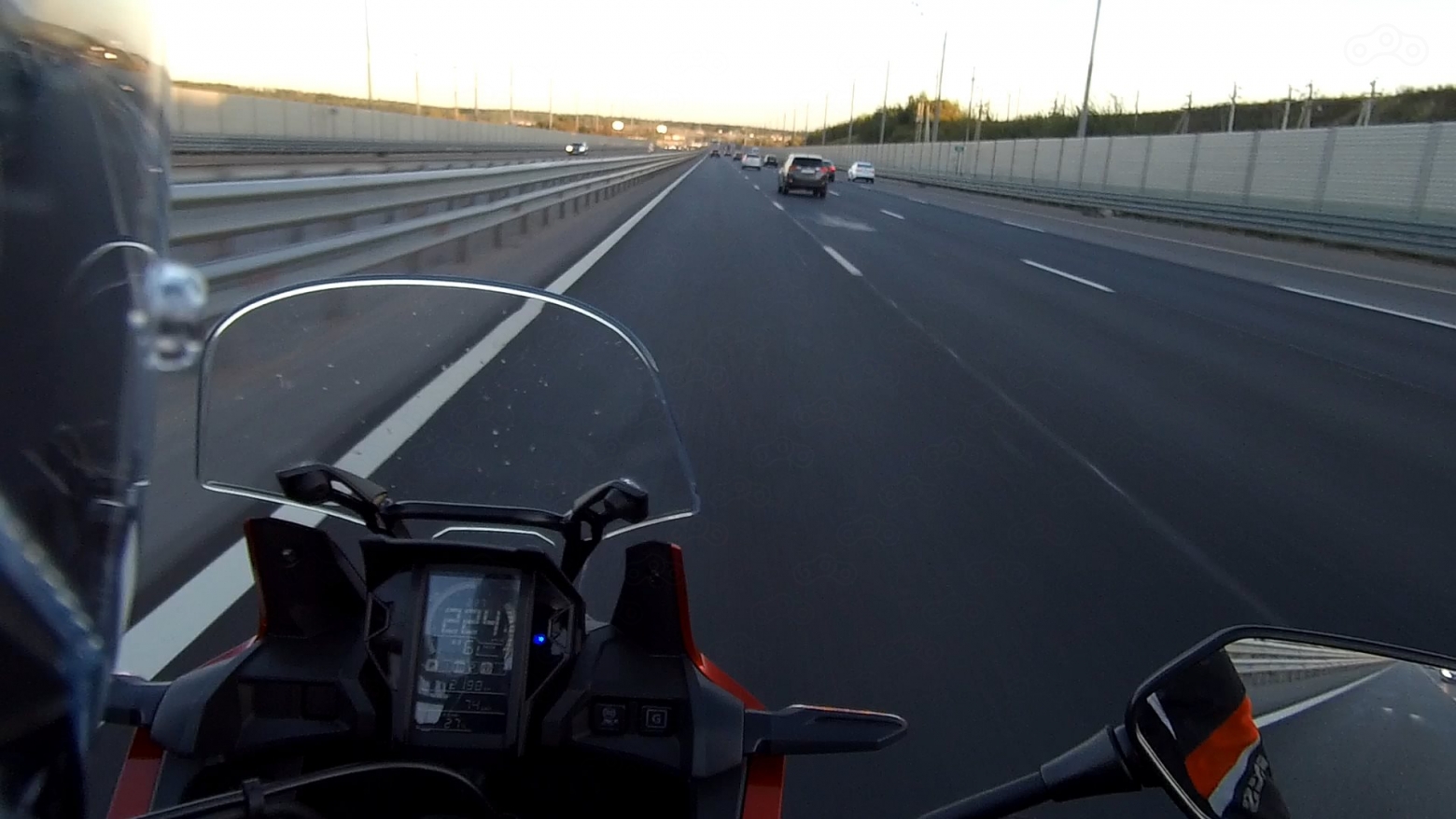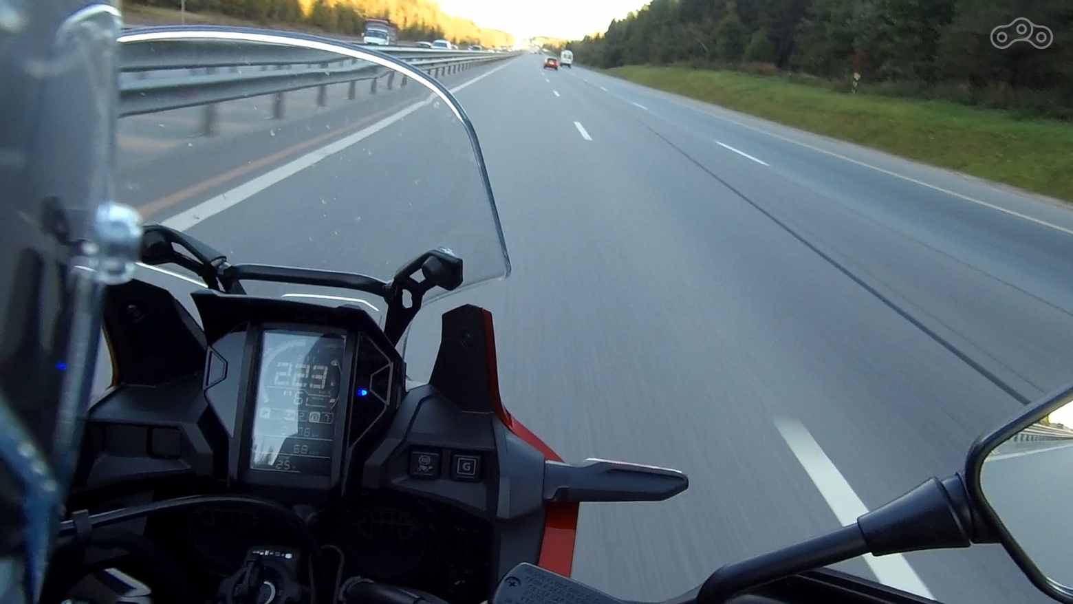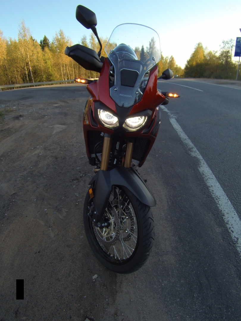 Управляемость супер лёгкая и приятная - байк рулится силой мысли. Вес? Его нет - на ходу мот ощущается пушинкой. Даже на околонулевых скоростях. При этом Африка абсолютно стабильно и уверенно себя чувствует и при езде в темпе за двести - никакой болтанки, нестабильности, и прочих неприятных явлений. На удивление, ветрозащита со стоковым небольшим стеклом оказалась вполне достойной - мне с моим ростом в 176 см было комфортно даже на высоких скоростях, и желания пригибаться не возникало. Дуло только в локти - в голову особо не дуло. Ну а более рослые и крупные товарищи всегда могут докупить увеличенное стекло из оригинального каталога аксессуаров, либо из многочисленных вариантов производителей афтермаркета. Уровень вибраций на Африке минимальный: на руле и седле их нет вообще, на подножках чуть-чуть есть только на высоких оборотах, но не досаждают. Эргономика великолепная: иначе как "эталонной" её и не назовёшь. Руль, подножки, седло - всё находится ровно на том месте где и должно быть. Сидишь прямо в удобной и естественной позе, видишь далеко. Всем частям тела комфортно - абсолютно ничего не затекает и не устаёт. Подвеска с огромными ходами и клирэнсом легко проглатывает всё, что бы не оказалось под колёсами. Обратной стороной длинноходных подвесок является то, что на резких разгонах Африка чуть подзадирает рожу вверх. Но мот это совершенно не портит - даже наоборот: эти задирания морды только веселят, и добавляют фана и эмоций при динамичной езде.