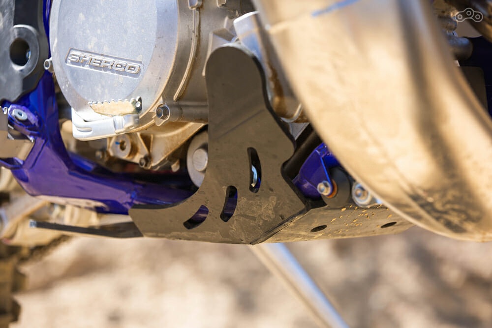 На Sherco установлены вилки KYB с закрытым картриджем и их же амортизатор с рычажным механизмом, а также покрышки Michelin Medium Enduro, которые имеют весьма жёсткий каркас. Это положительно сказывается на управляемости, особенно на больших скоростях: Sherco отлично маневрирует по самым разным типам грунта и очень предсказуема в поворотах. Также мотоцикл оснащён вентилятором радиатора и бачком для сбора охлаждающей жидкости — это действительно полезная опция для тех, кто любит катать по узким и техничным трассам.