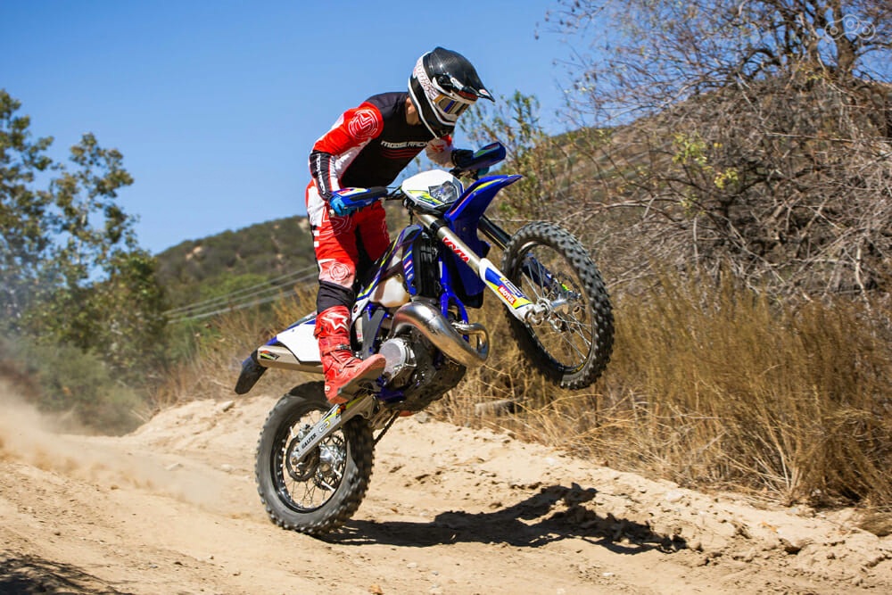 Двигатель — отличительная черта 300 SE. Он легко подрывается с места в тот момент, когда вам это нужно, но при этом обладает потрясающей тягой и управляемостью (особенно при использовании альтернативной настройки карты зажигания, которая активируется с помощью удобного переключателя на руле). В отличие от многих других мотоциклов с преднастройками карт, на 300 SE разница между режимами очень заметна. Если вы ездили на 500-кубовом двухтактнике, то ощущения от 300-кубового Sherco с настройками на максимальную производительность очень на него похожи. Балансирный вал значительно снижает вибрации мотора: это особенно заметно в сравнении с двухтактными двигателями старшего поколения.