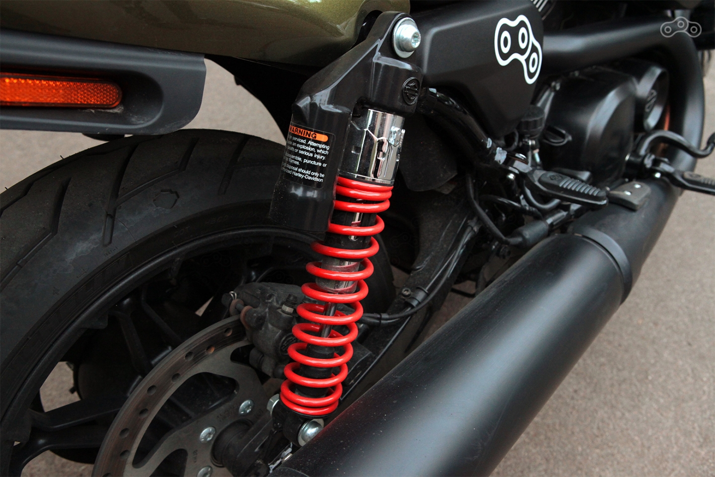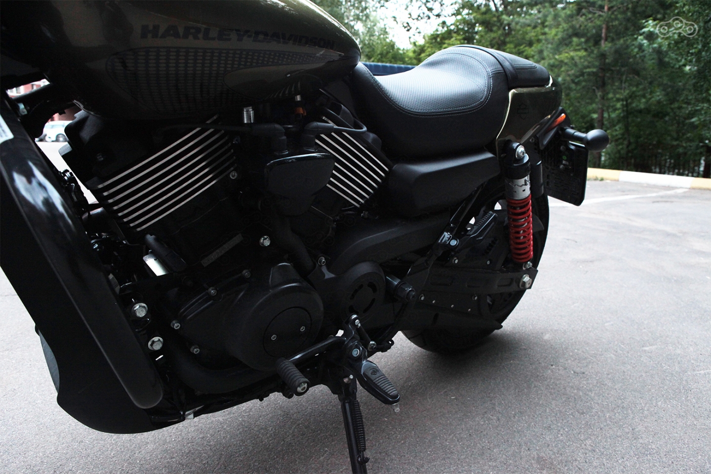 Что касается шасси – никогда ещё мотоцикл с надписью HD на баке не рулился так легко! Да, жёсткостью стальная рама и стальной же маятник не поражают, но она здесь и ни к чему. Важно другое – угол рулевой колонки Street Rod, в отличие от «круизёрного» наклона рулевой колонки Street 750, стал меньше и теперь составляет 27°, благодаря чему управляемость стала острее и азартней. Сама передняя вилка теперь не простая, а перевёрнутая, с трубами диаметром 43 мм.