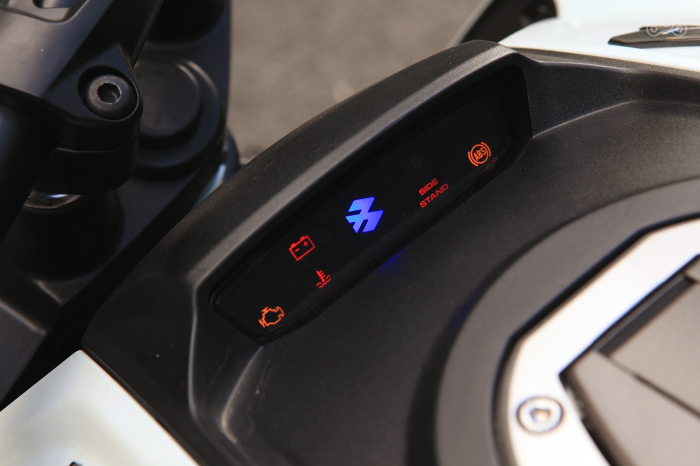 А вот приборная панель, вернее две – решение новое и, безусловно, интересное. Первая, традиционно расположенная над верхней траверсой, представляет из себя монохромный дисплей с лентой тахометра, спидометром, счётчиком пробегов, часиками, указателем уровня топлива и блинкером, вторая, прописанная на баке, состоит из блока контрольных ламп. ABS, «чекэнджин», «дальний свет» и, конечно, куда же без этого, синего логотипа Bajaj.