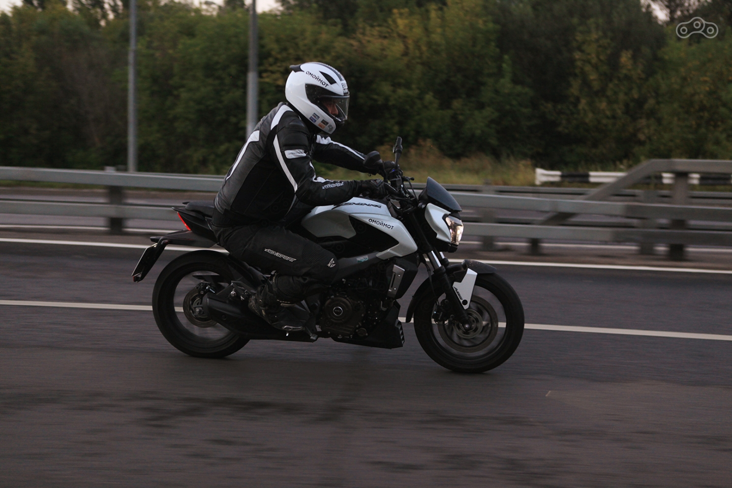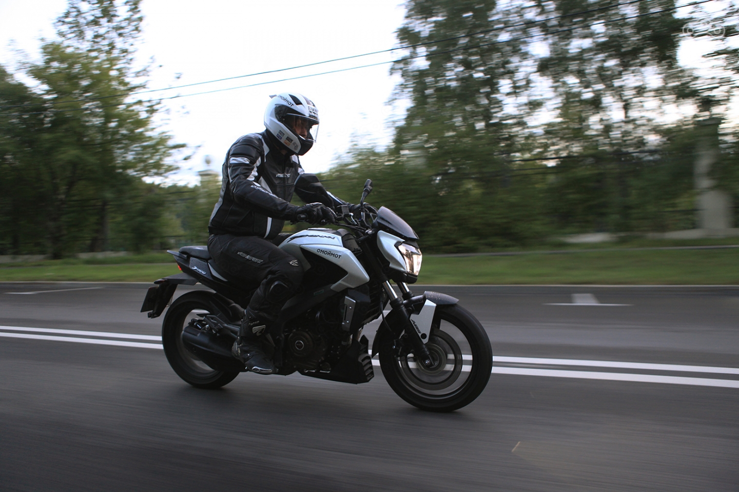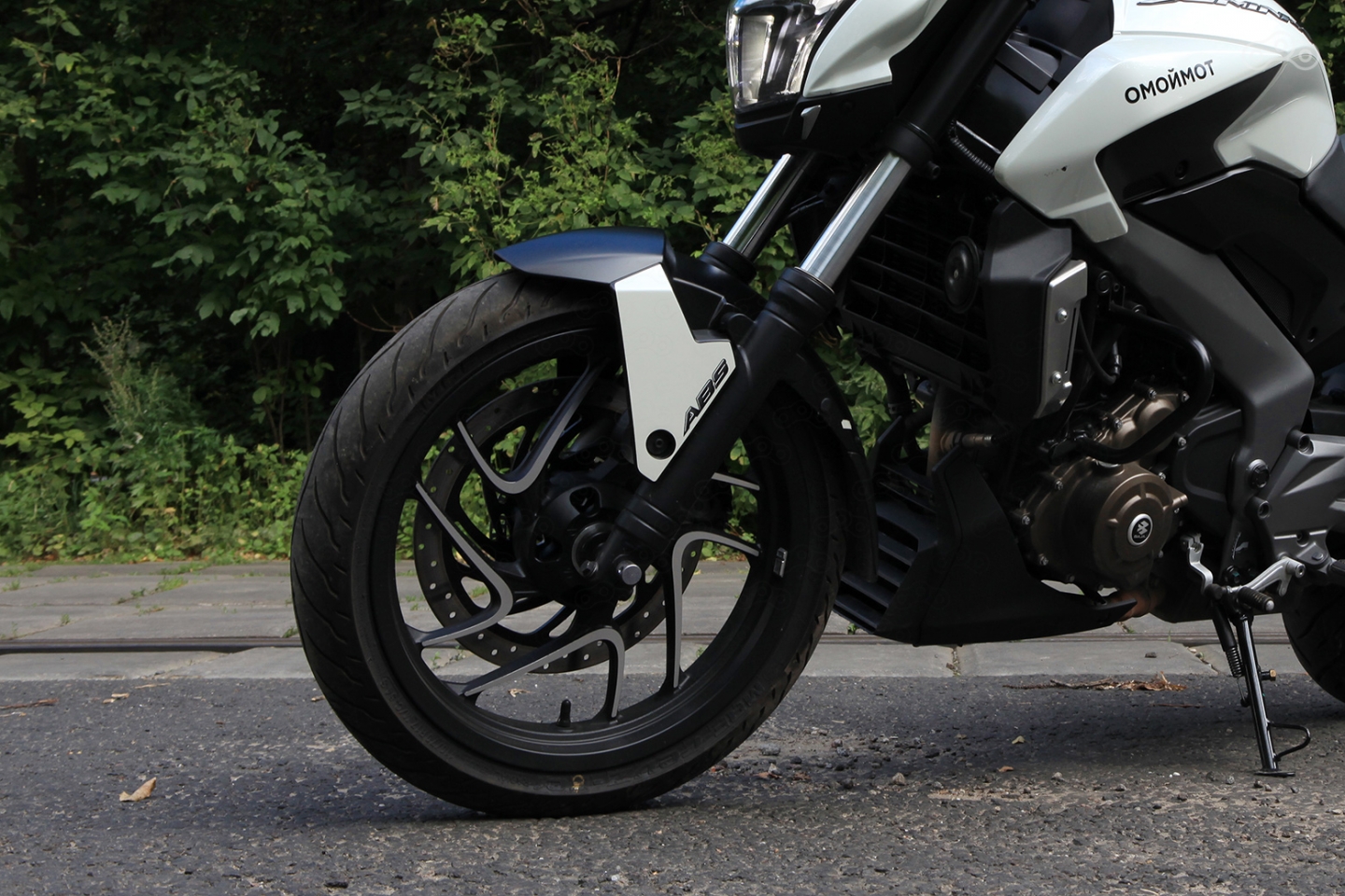 А вот штатная резина отвратительна – на мокром асфальте держак отсутствует даже в теплую погоду, чего уж говорить про осень и весну, так что её менять в обязательном порядке, если хотите ездить хоть сколько-нибудь быстро. На том что есть – страшновато, хотя и можно. Геометрия шасси не отличается остротой, реакции на руль не назвать нервными, но, в отличие от того же Duke 390, Dominar 400 на звание драйверской зажигалки не претендует.