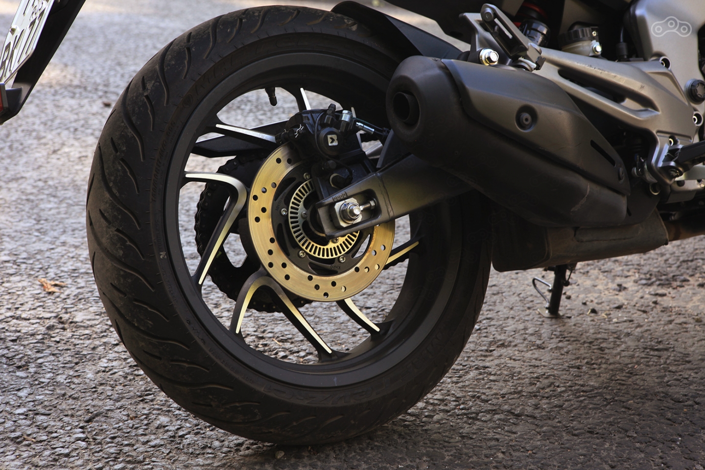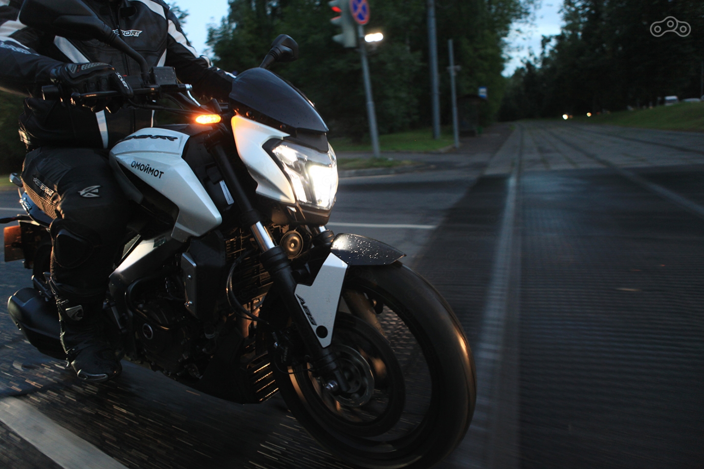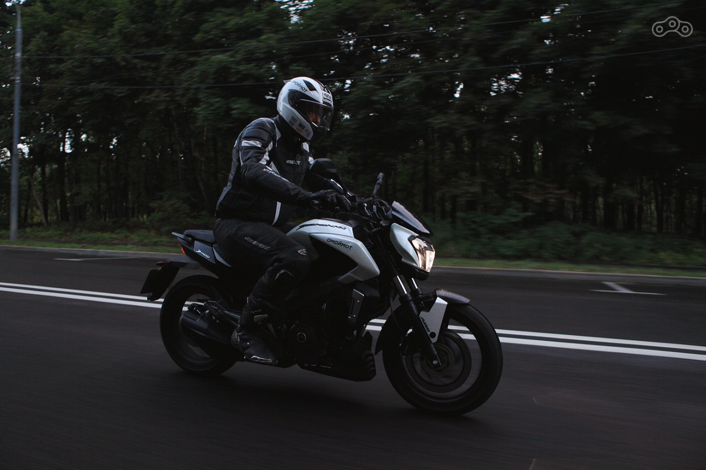 А вот штатная резина отвратительна – на мокром асфальте держак отсутствует даже в теплую погоду, чего уж говорить про осень и весну, так что её менять в обязательном порядке, если хотите ездить хоть сколько-нибудь быстро. На том что есть – страшновато, хотя и можно. Геометрия шасси не отличается остротой, реакции на руль не назвать нервными, но, в отличие от того же Duke 390, Dominar 400 на звание драйверской зажигалки не претендует.